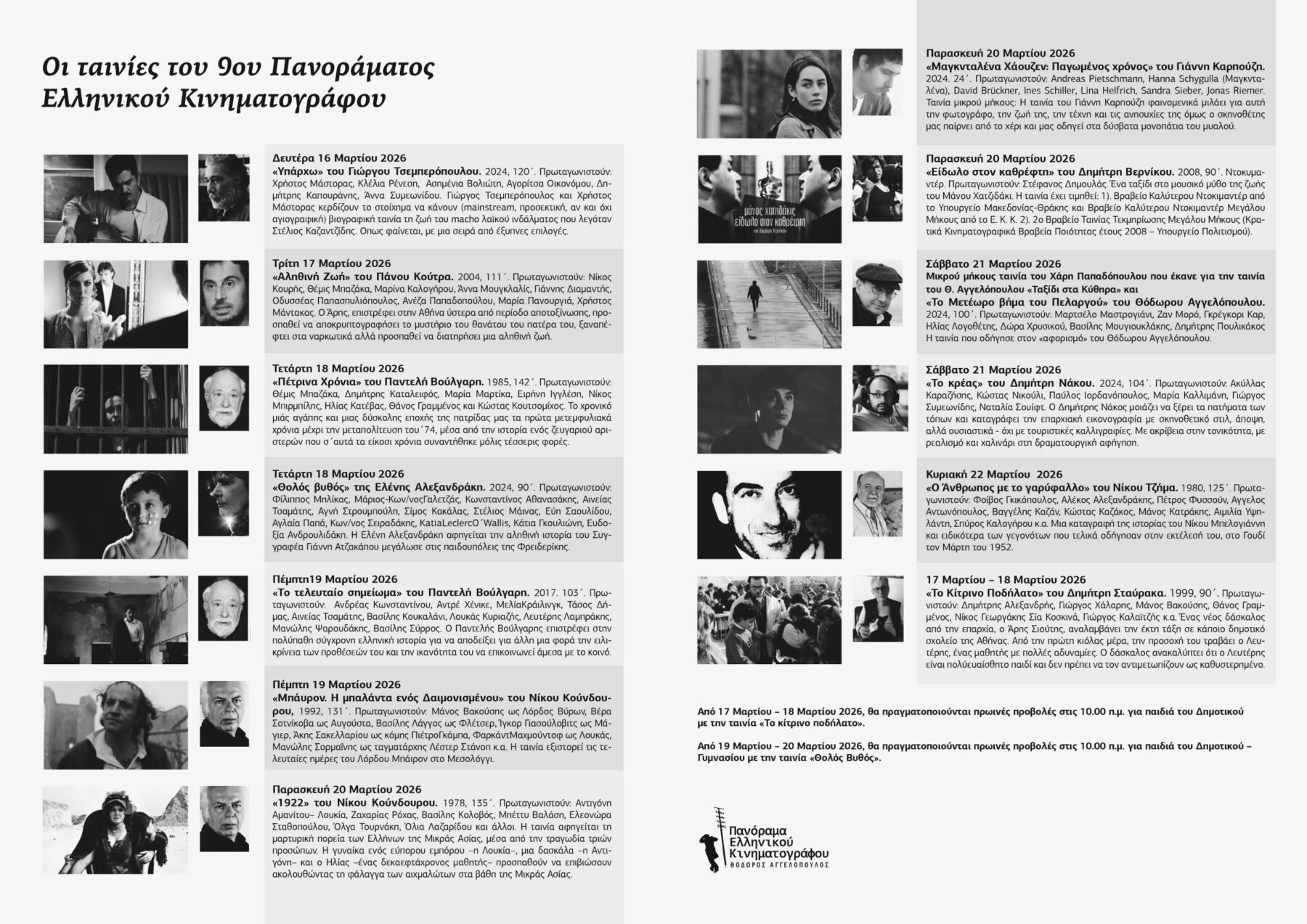 Παρασκευή 20/03/2026: 10.00 μ.μ. Πρωινή προβολή για μαθητές Γυμνασίου και Λυκείου με την ταινία «Θολός Βυθός» της Ελένης Αλεξανδράκη. Στις 7.00 μ.μ. θα παίξει το σύνολο μιούζικαλ και μουσικής κινηματογράφου του Μουσικού σχολείου Λάρισας. Ακολουθούν βραδινές προβολές με τις ταινίες 7.20 μ.μ. «1922» του Νίκου Κούνδουρου και στις 9.45 μ.μ. το ντοκιμαντέρ του Δημήτρη Βερνίκου «Χατζιδάκις: Είδωλο στον Καθρέφτη». Θα παρευρεθεί ο σκηνοθέτης θα τιμηθεί και θα συνομιλήσει με το κοινό.