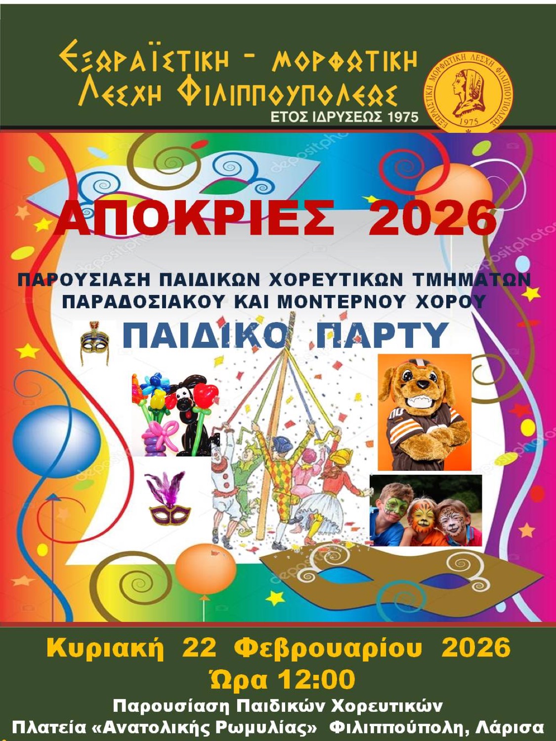 Μπαλονοκατασκευές, ζωγραφική προσώπου μαζί με παιχνίδια για τους μικρούς μας φίλους, την Κυριακή 22 Φεβρουαρίου 2026 από τις 12:00 σε μια αποκριάτικη γιορτή για όλα τα παιδιά της συνοικίας και όχι μόνο