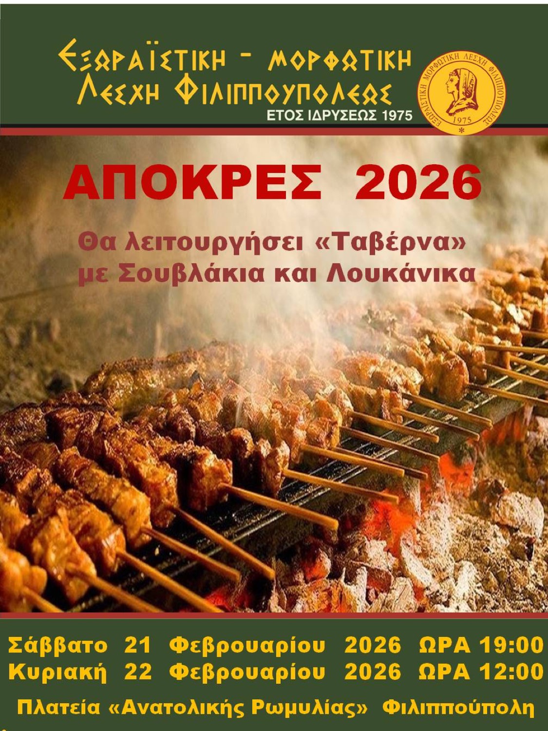 Άφθονο δωρεάν κρασί, χοροί και τραγούδια, από παραδοσιακή ορχήστρα, σε συνδυασμό με τη λειτουργία της «Ταβέρνας» από τη Λέσχη, με λουκάνικα και σουβλάκια, το βράδυ του Σαββάτου 21 Φεβρουαρίου και το μεσημέρι της Κυριακής 22 Φεβρουαρίου 2026, εγγυώνται ένα όμορφο, παραδοσιακό γλέντι.