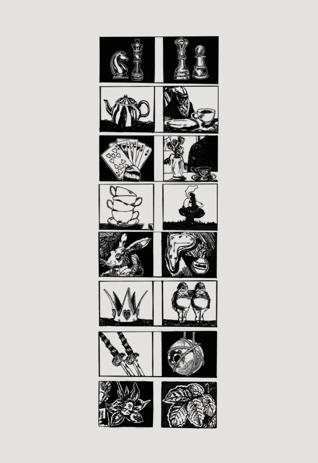 Μέσα από τη χαρακτική σε λινόλεουμ, η καλλιτέχνις πειραματίζεται με τη σύνθεση γνωστών έργων της ιστορίας της τέχνης και εμβληματικών χαρακτήρων του Carroll, δημιουργώντας πρωτότυπα mash-ups γεμάτα συμβολισμούς, ανατροπές και χιούμορ. Η τεχνική ακρίβεια της χαρακτικής συνδυάζεται με τη φαντασία και την αφήγηση, δίνοντας στα έργα μια μοναδική αίσθηση βάθους και μαγείας.