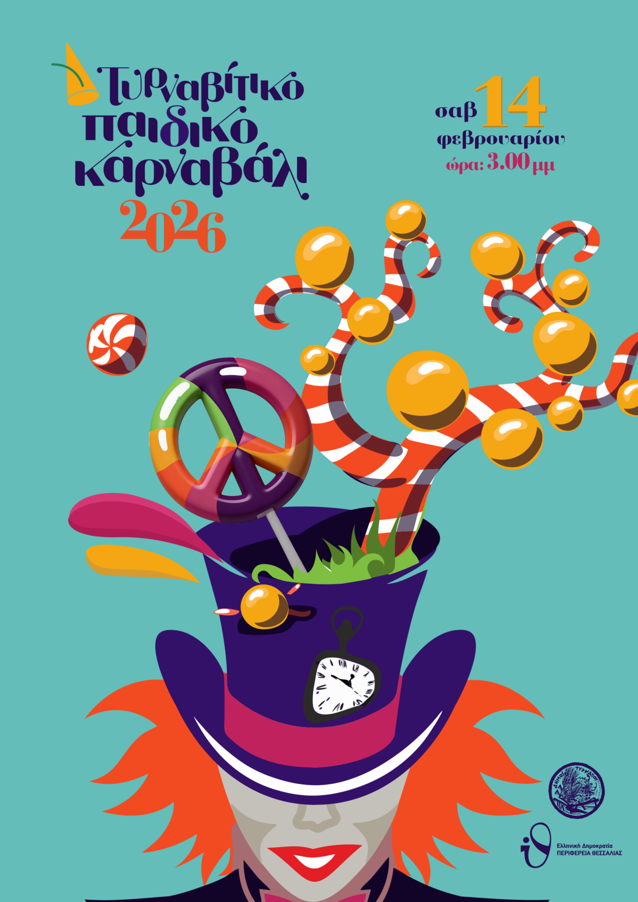 Ο αγαπημένος μας Τρελοκαπελάς επιστρέφει και φέρνει μαζί του το πιο γλυκό μήνυμα! Στο 3ο Παιδικό Καρναβάλι Τυρνάβου, το μαγικό καπέλο γεμίζει ζαχαρωτά και ένα μεγάλο, πολύχρωμο γλειφιτζούρι σε σχήμα Ειρήνης γίνεται ο οδηγός μας. Μια έκρηξη από τυρκουάζ, μωβ και πορτοκαλί προσκαλεί κάθε παιδί σε μια γιορτή γεμάτη φως, χρώμα και ελπίδα. Ελάτε να χορέψουμε για έναν κόσμο πιο γλυκό και ειρηνικό!