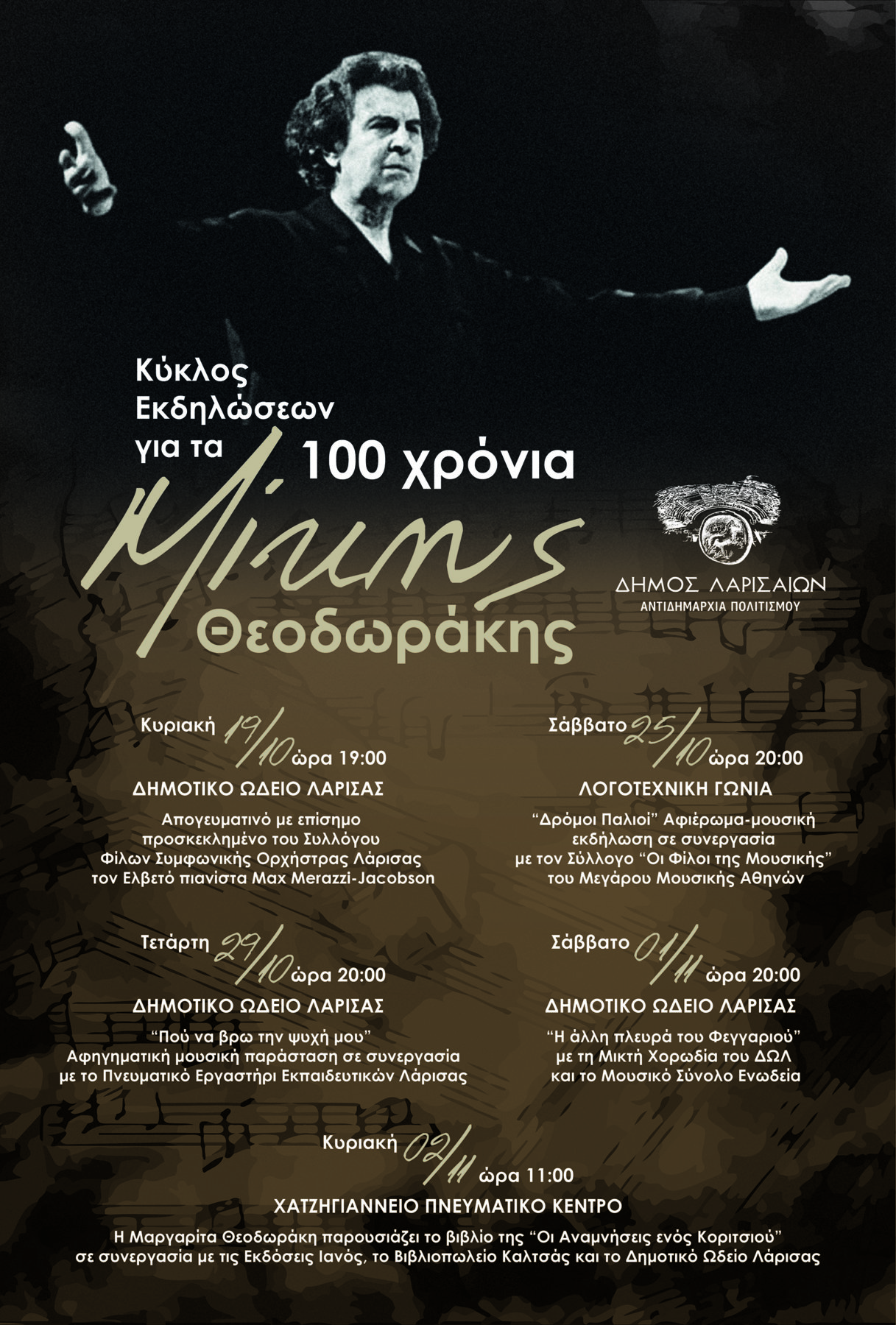 Αφιέρωμα στον συνθέτη Μίκη Θεοδωράκη με τίτλο “Δρόμοι Παλιοί”, με αφορμή και τη συμπλήρωση 100 χρόνων από τη γέννησή του, διοργανώνει η Αντιδημαρχία Πολιτισμού του Δήμου Λαρισαίων, σε συνεργασία με τον Σύλλογο “Οι Φίλοι της Μουσικής”, το Σάββατο 25 Οκτωβρίου 2025 και ώρα 20:00 στη Λογοτεχνική Γωνία.