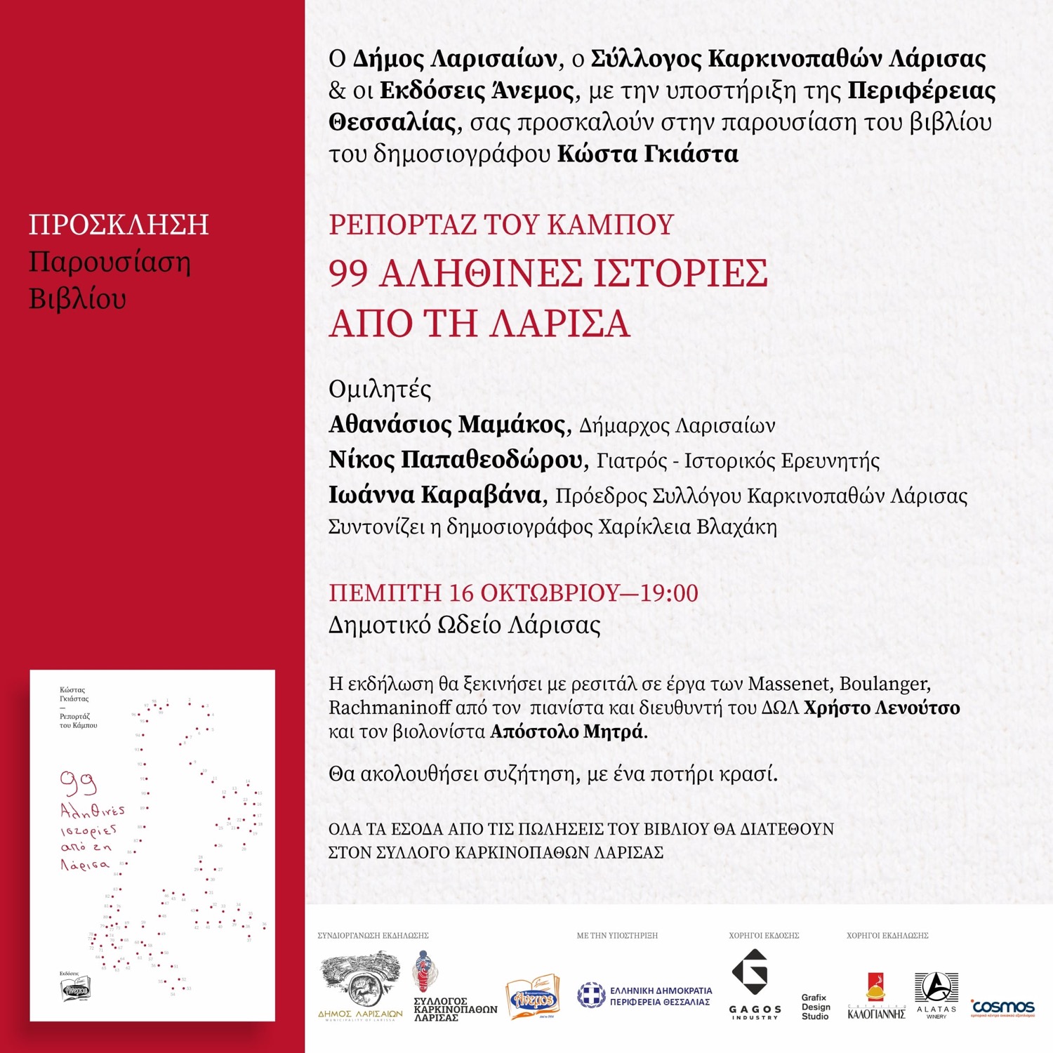 Το βιβλίο πωλείται στα βιβλιοπωλεία της πόλης αλλά και online από την παρακάτω διεύθυνση: https://anemos-book.gr/99-alhthines-istories-apo-th-larisa
