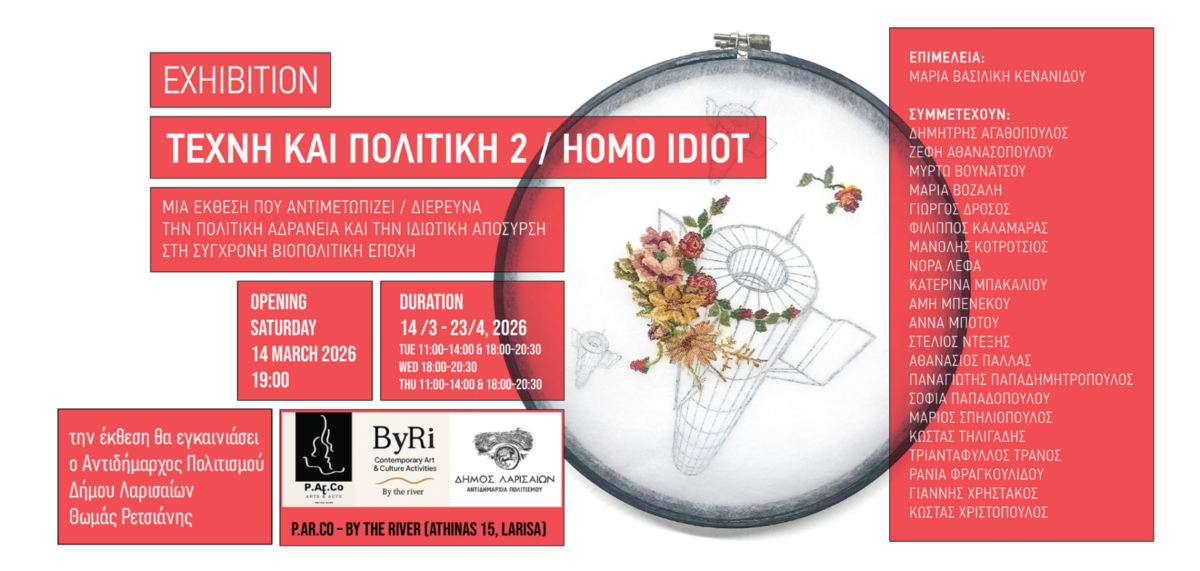 Τα εγκαίνια της έκθεσης με τίτλο «Τέχνη και πολιτική 2/HOMO IDIOT” θα πραγματοποιηθούν το Σάββατο 14 Μαρτίου στις 7μμ, από τον Αντιδήμαρχο Πολιτισμού Δήμου Λαρισαίων κ. Θωμά Ρετσιάνη, στον χώρο Τέχνης και Πολιτισμού, PArCo-By the River, Αθηνάς 15, στη Λάρισα.