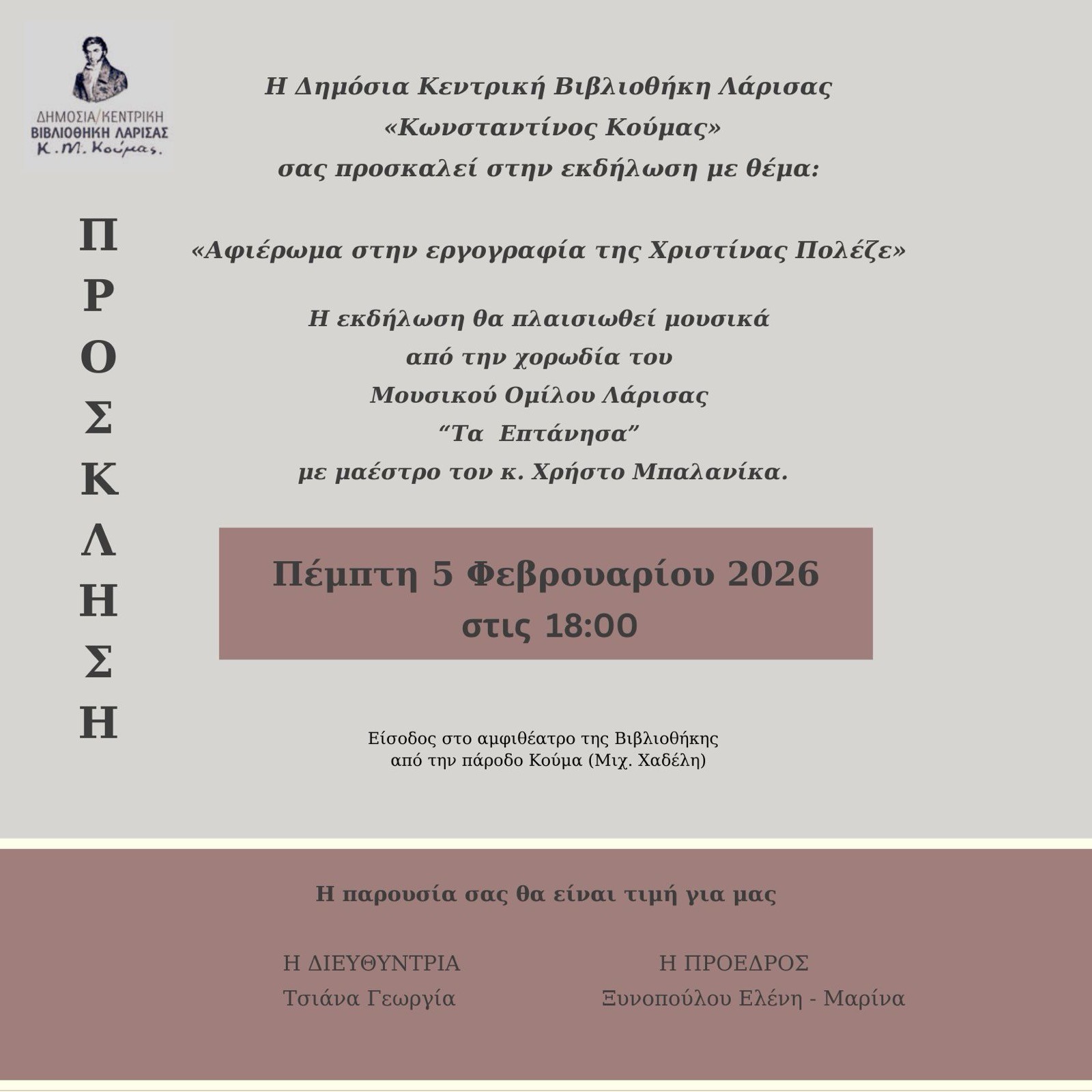 Ενημέρωση της Δημόσιας Κεντρικής Βιβλιοθήκης Λάρισας αναφορικά με εκδήλωση – αφιέρωμα στην εργογραφία της Χριστίνας Πολέζε, η οποία θα λάβει χώρα την ερχόμενη Πέμπτη 5 Φεβρουαρίου.