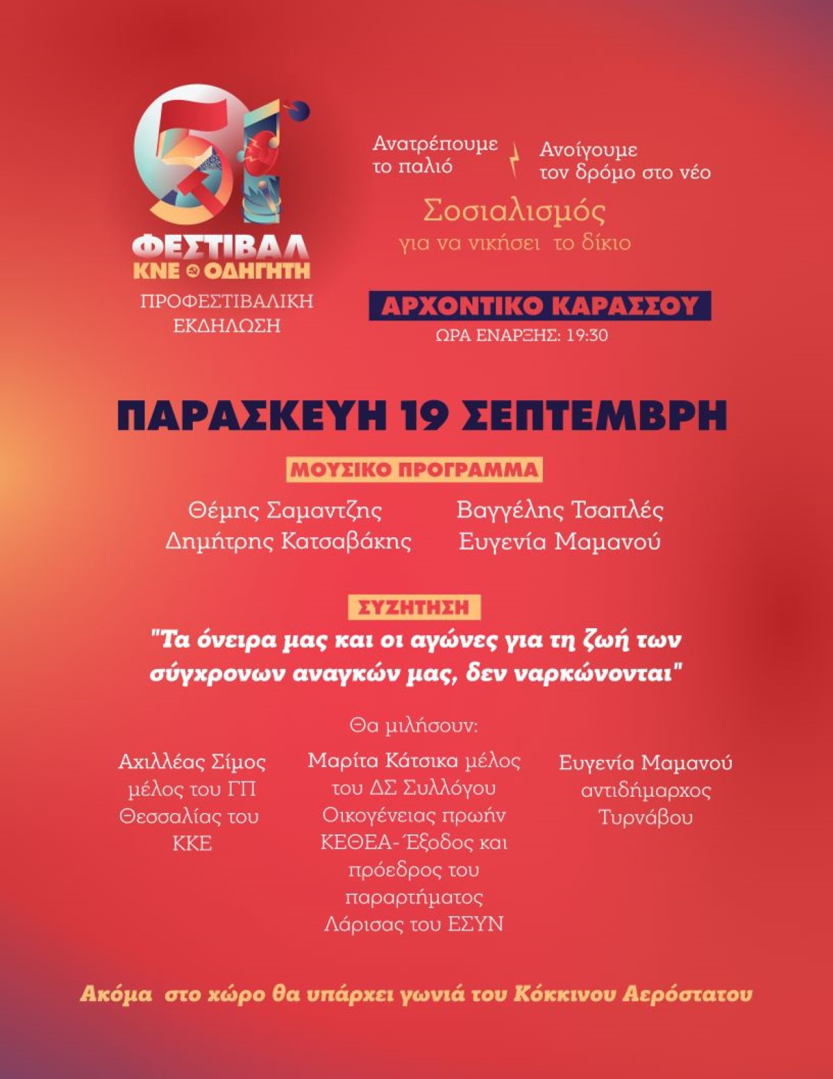«Οι οργανώσεις Τυρνάβου του ΚΚΕ και η Τ.Ο. Λάρισας της ΚΝΕ διοργανώνουν εκδήλωση με θέμα : «Τα όνειρα και οι αγώνες για τη ζωή των σύγχρονων αναγκών μας δεν ναρκώνονται». Στην εκδήλωση που θα γίνει την Παρασκευή 19 Σεπτέμβρη στις 19:30 στο αρχοντικό Καρασσου θα μιλήσουν οι: Αχιλλέας Σίμος, μέλος του ΓΠ Θεσσαλίας του ΚΚΕ, Ευγενία Μαμανου , αντιδήμαρχος Τυρνάβου και η Μαρίτα Κάτσικα, μέλος του ΔΣ του Συλλόγου Οικογένειας πρώην ΚΕΘΕΑ – Εξοδος και πρόεδρος του Παραρτήματος Λάρισας του ΕΣΥΝ. Θα ακολουθήσει μουσικό πρόγραμμα με την Ευγενία Μαμανου, το Θέμη Σαμαντζή, το Δημήτρη Κατσαβάκη και τον Βαγγέλη Τσαπλε.»