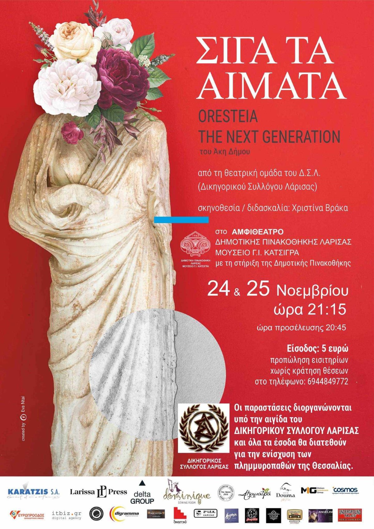 Τη θεατρική παράσταση “Σιγά τα αίματα – Oresteia the next generation” του Άκη Δήμου παρουσιάζει η Θεατρική Ομάδα του Δικηγορικού Συλλόγου Λάρισας στις 24 και 25 Νοεμβρίου στο Αμφιθέατρο της Δημοτικής Πινακοθήκης Λάρισας – Μουσείο Γ.Ι. Κατσίγρα, με ώρα προσέλευσης 20:45.