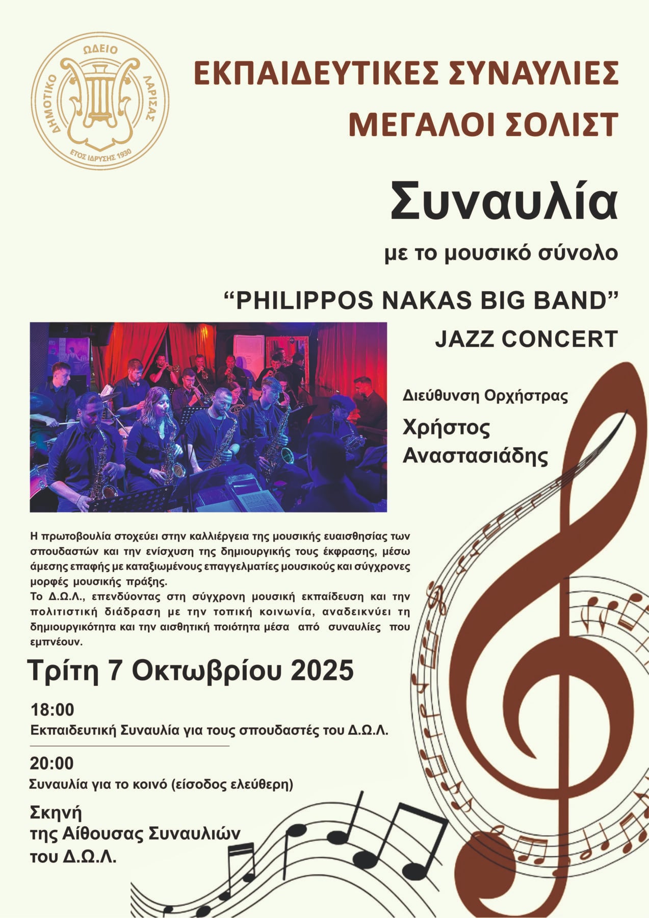 Μια ξεχωριστή δράση αφιερωμένη στην τζαζ μουσική και την ιστορική εξέλιξη της Big Band, διοργανώνεται την Τρίτη 7 Οκτωβρίου 2025, στις 20:00, στην αίθουσα συναυλιών του Δημοτικού Ωδείου Λάρισας, με δωρεάν είσοδο για το κοινό και στις 18:00, για τους σπουδαστές του Δ.Ω.Λ. Η δράση εντάσσεται στο πλαίσιο του εκπαιδευτικού προγραμματισμού του Δημοτικού Ωδείου Λάρισας και της σειράς «Εκπαιδευτικές Συναυλίες – Μεγάλοι Σολίστ».