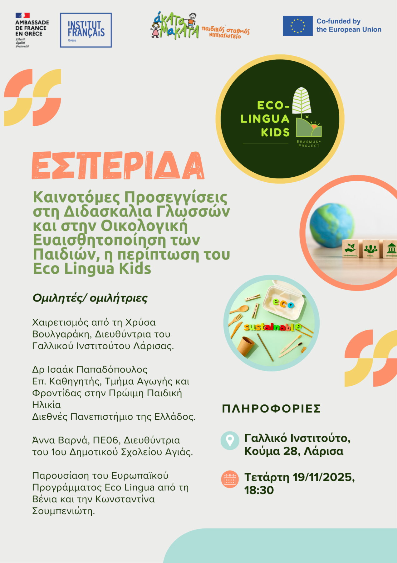 Το Γαλλικό Ινστιτούτο Λάρισας – Γαλλική Πρεσβεία και το ιδιωτικό νηπιαγωγείο Άκατα Μάκατα, ως εταίρος του ευρωπαϊκού προγράμματος Erasmus+ ECO-LINGUA KIDS (Eco – Lingua Kids: Second language acquisition through an environmentally focused approach for pre-school and primary school children. Project No: KA220-SCH-D22337A0) διοργανώνει την τελική εκδήλωση διάχυσης (Multiplier Event) του έργου με τίτλο «Εσπερίδα: Καινοτόμες προσεγγίσεις στη διδασκαλία γλωσσών και στην οικολογική ευαισθητοποίηση των παιδιών – Η περίπτωση του ECO-LINGUA KIDS», την Τετάρτη 19 Νοεμβρίου 2025, στις 18:30, στο Γαλλικό Ινστιτούτο Λάρισας.