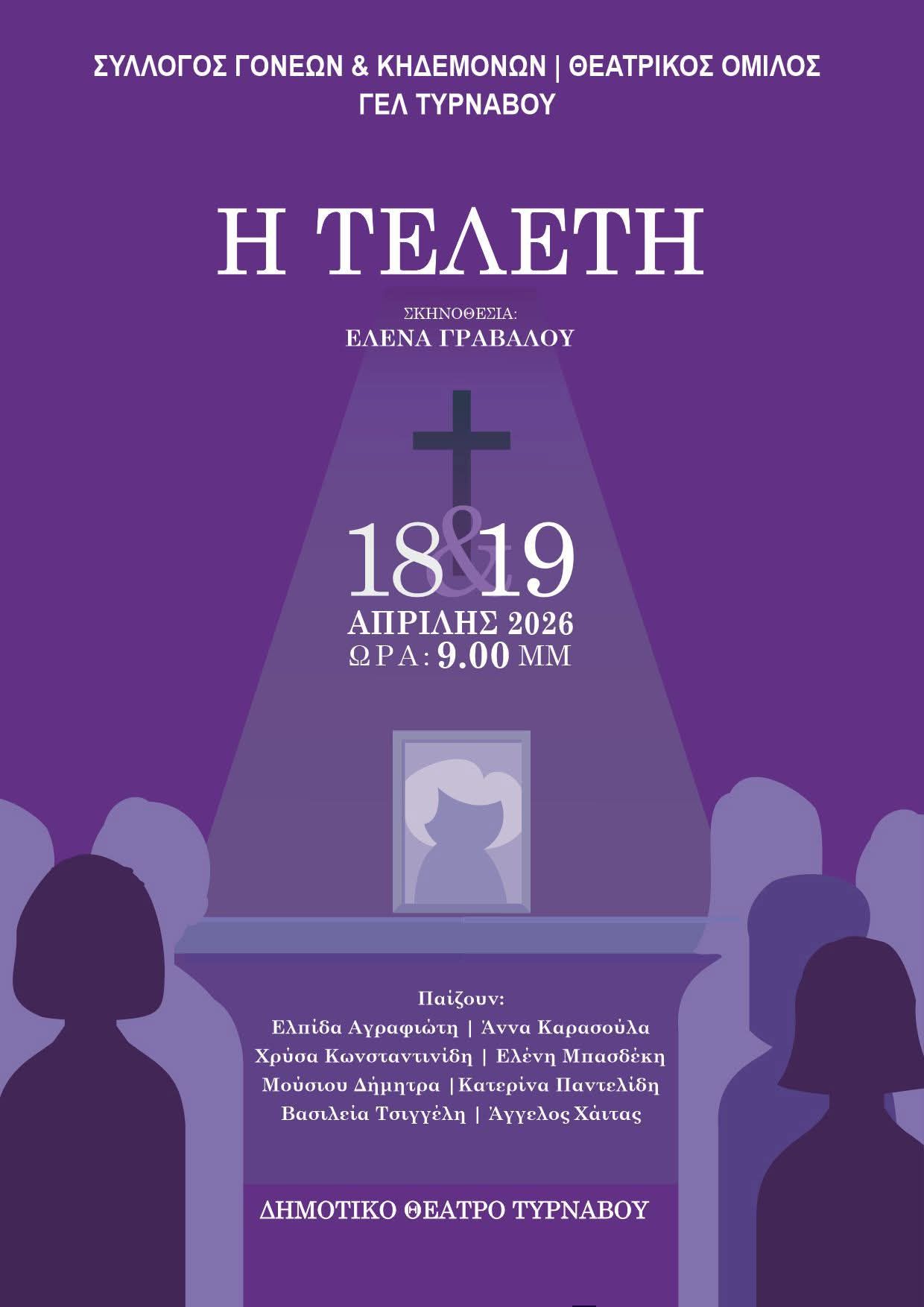 Ο Θεατρικός Όμιλος του Γενικού Λυκείου Τυρνάβου παρουσιάζει το Σάββατο 18 Απριλίου 2026 και την Κυριακή 19 Απριλίου 2026, στις 21:00, στο Δημοτικό Θέατρο Τυρνάβου, τη μαύρη κωμωδία «Η Τελετή» του Παύλου Μάτεσι.