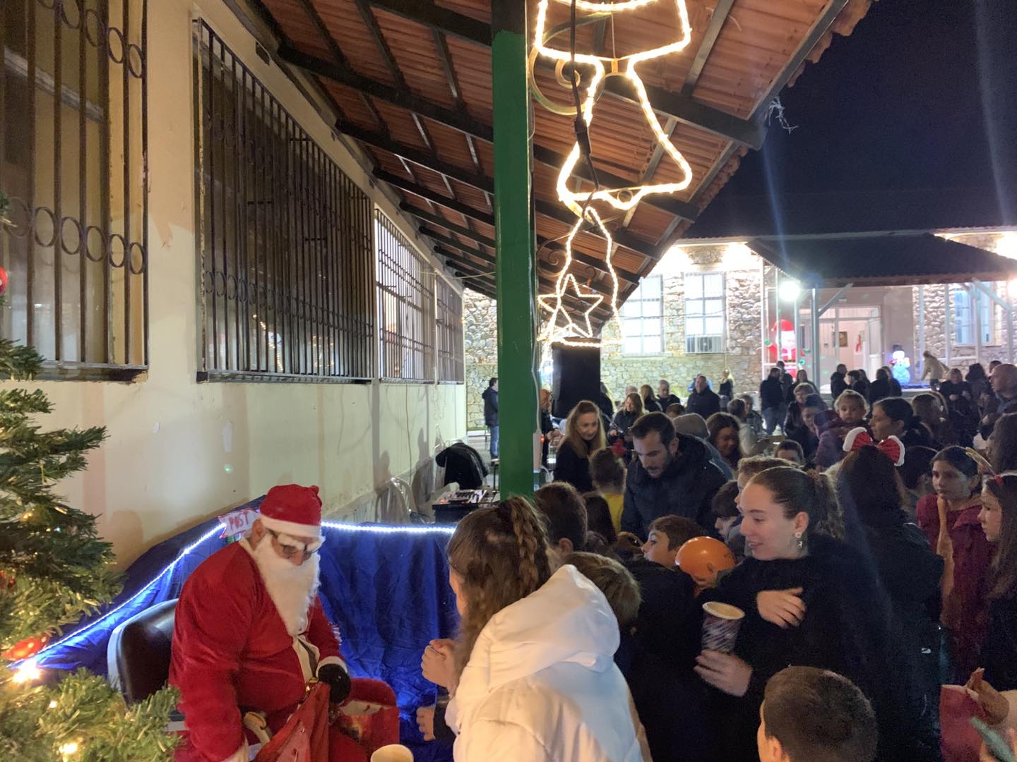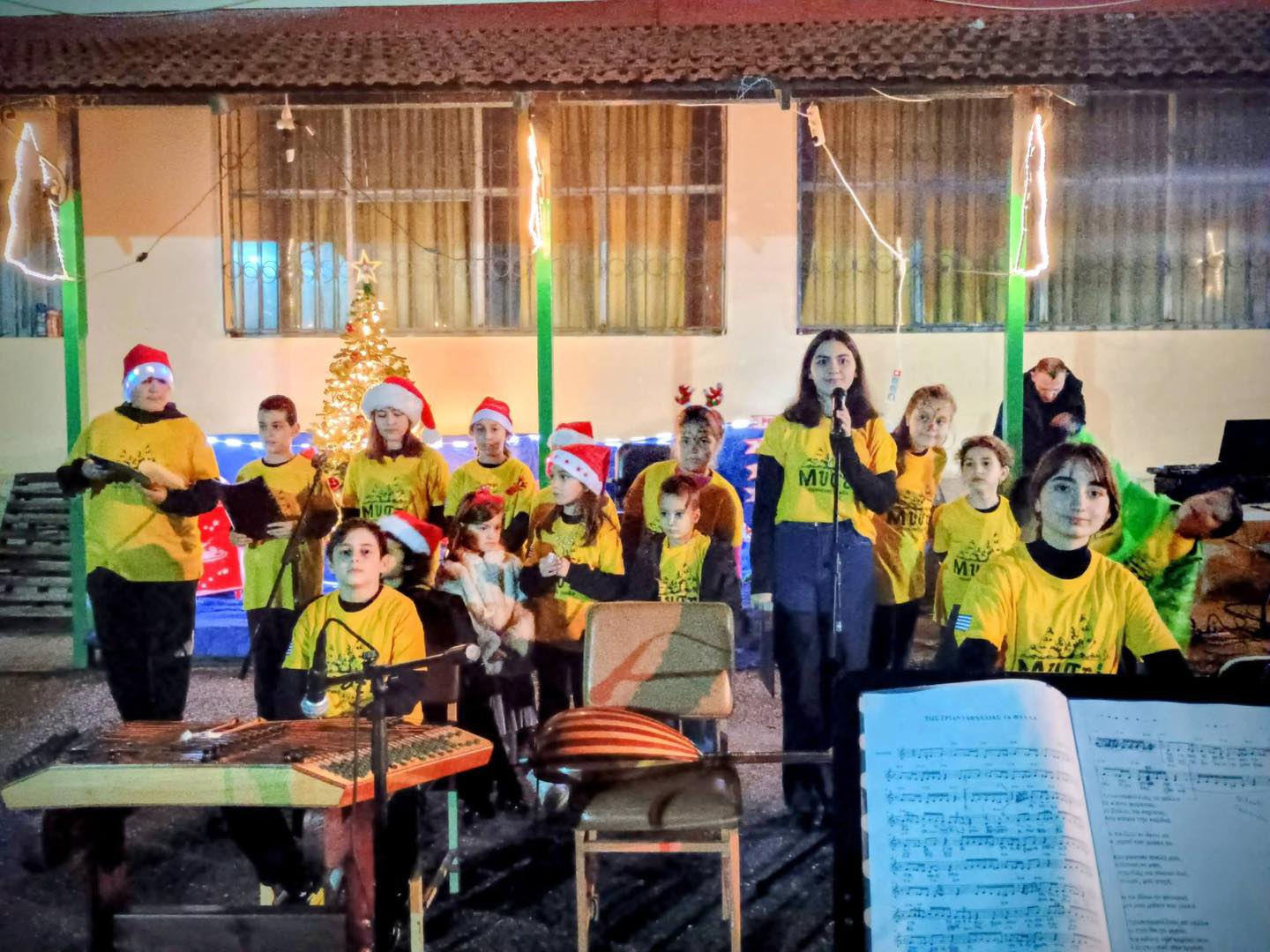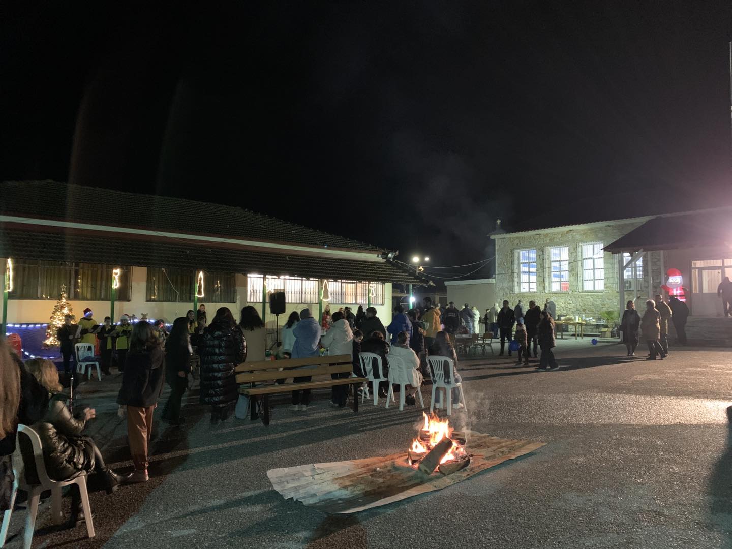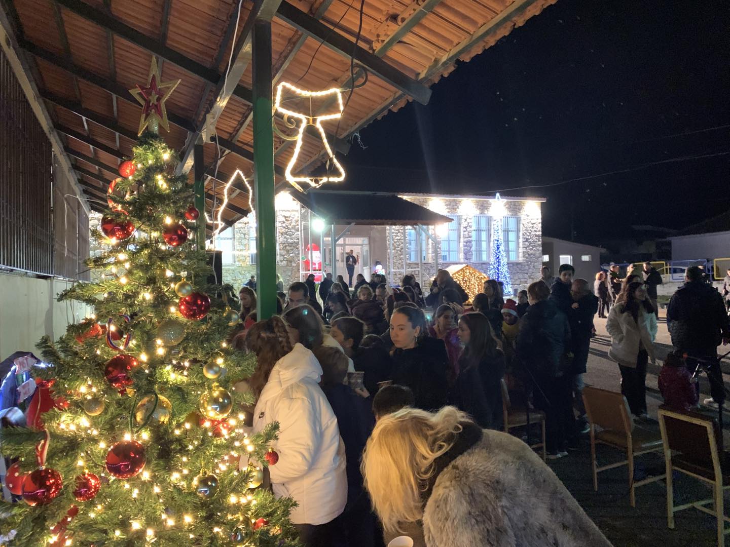 Μικροί και μεγάλοι συγκεντρώθηκαν στο προαύλιο του Πολιτιστικού Κέντρου (πρώην σχολείου) για να υποδεχτούν επίσημα το πνεύμα των γιορτών. Τα λαμπάκια άναψαν, η χορωδία έψαλε τα κάλαντα, το δέντρο φωτίστηκε και η ατμόσφαιρα πλημμύρισε από μουσικές, γέλια.