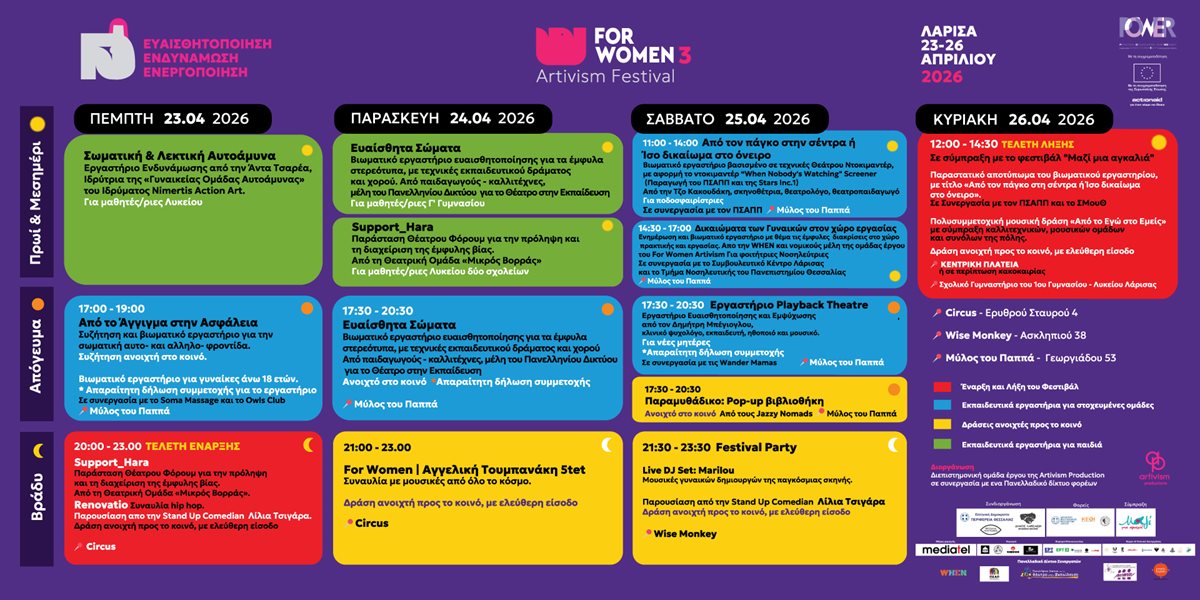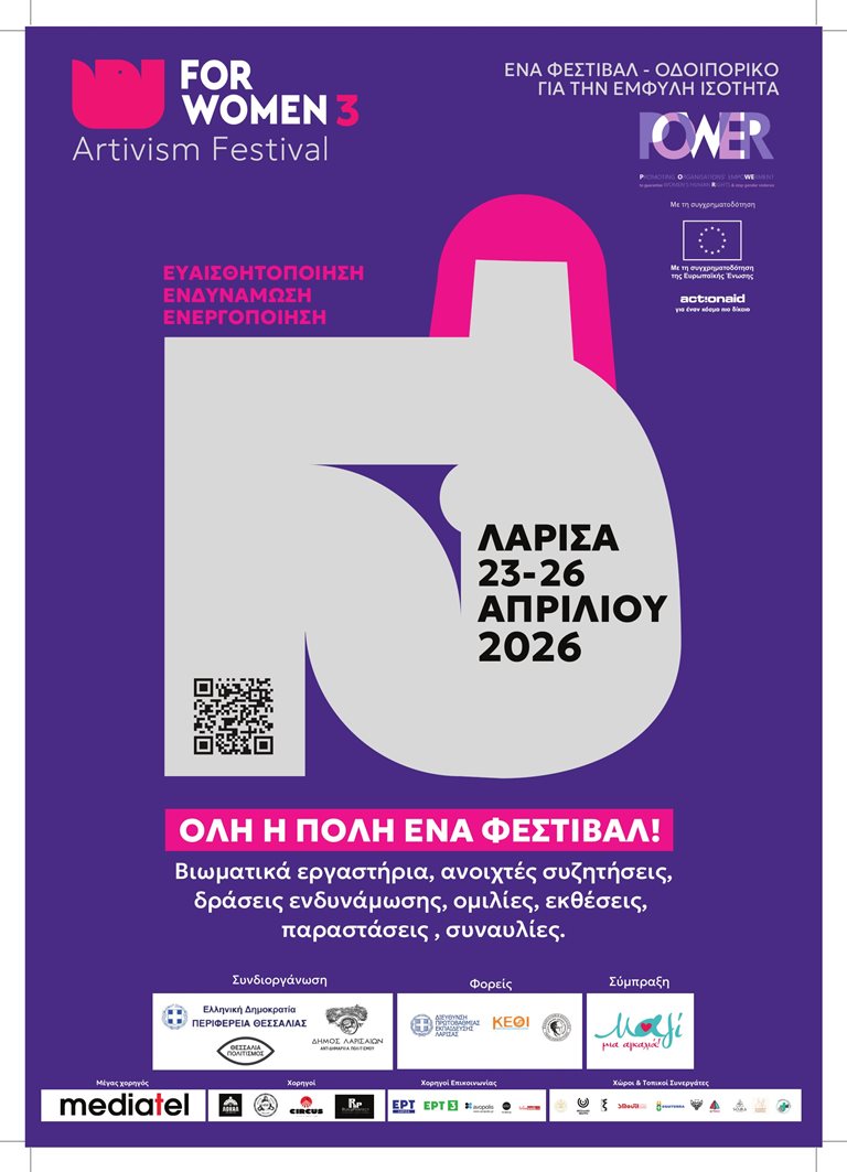 Μετά τις επιτυχημένες διοργανώσεις σε Τρίκαλα (Νοέμβριος 2024) και Καρδίτσα (Μάιος 2025), το FOR WOMEN Artivism Festival έρχεται στη Λάρισα από 23 έως 26 Απριλίου, 2026.