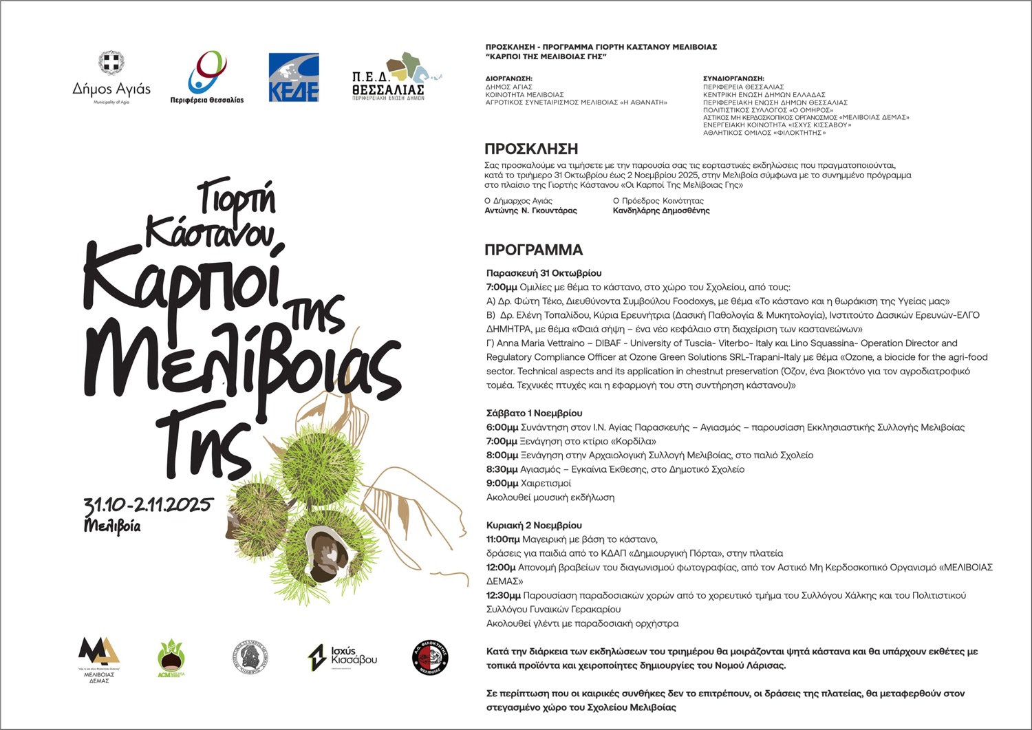 Ξεκινούν την Παρασκευή 31 Οκτωβρίου οι τριήμερες εκδηλώσεις του Δήμου Αγιάς για τη Γιορτή Κάστανου της Μελιβοίας, οι οποίες διοργανώνονται από το Δήμο Αγιάς, την Κοινότητα Μελιβοίας και τον Αγροτικό Συνεταιρισμό Μελιβοίας «Η Αθανάτη».