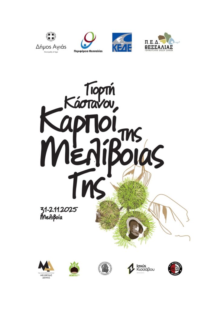 Ξεκινούν την Παρασκευή 31 Οκτωβρίου οι τριήμερες εκδηλώσεις του Δήμου Αγιάς για τη Γιορτή Κάστανου της Μελιβοίας, οι οποίες διοργανώνονται από το Δήμο Αγιάς, την Κοινότητα Μελιβοίας και τον Αγροτικό Συνεταιρισμό Μελιβοίας «Η Αθανάτη».