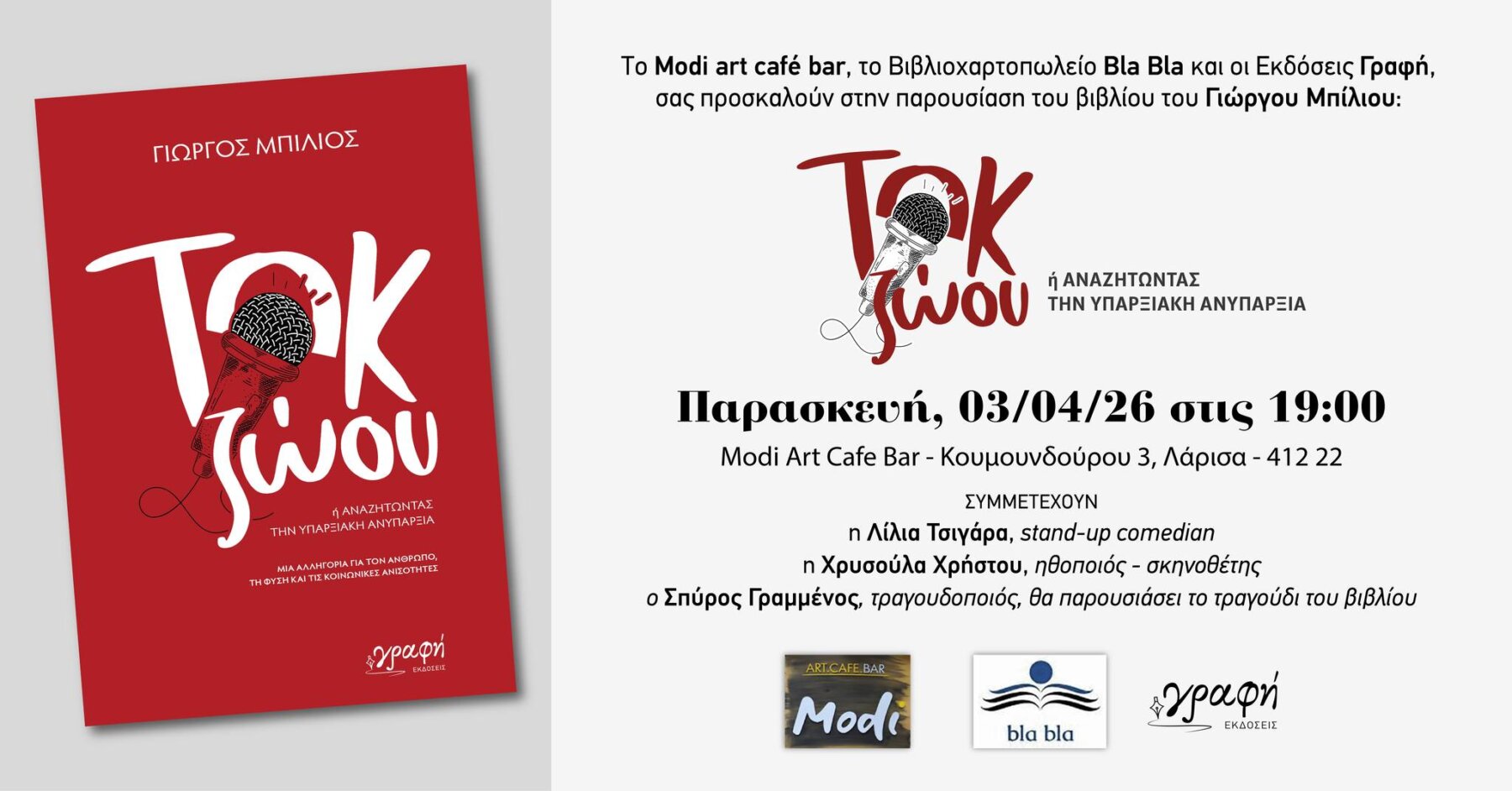 To Μodi art café bar, οι Εκδόσεις Γραφή και το Βιβλιοχαρτοπωλείο Bla Bla, σας προσκαλούν την Παρασκευή 3 Απριλίου 2026 και ώρα 19:00, στο Modi Art Cafe Bar, στην παρουσίαση του βιβλίου με τίτλο «Τοκ Ζώου» του συγγραφέα Γιώργου Μπίλιου.