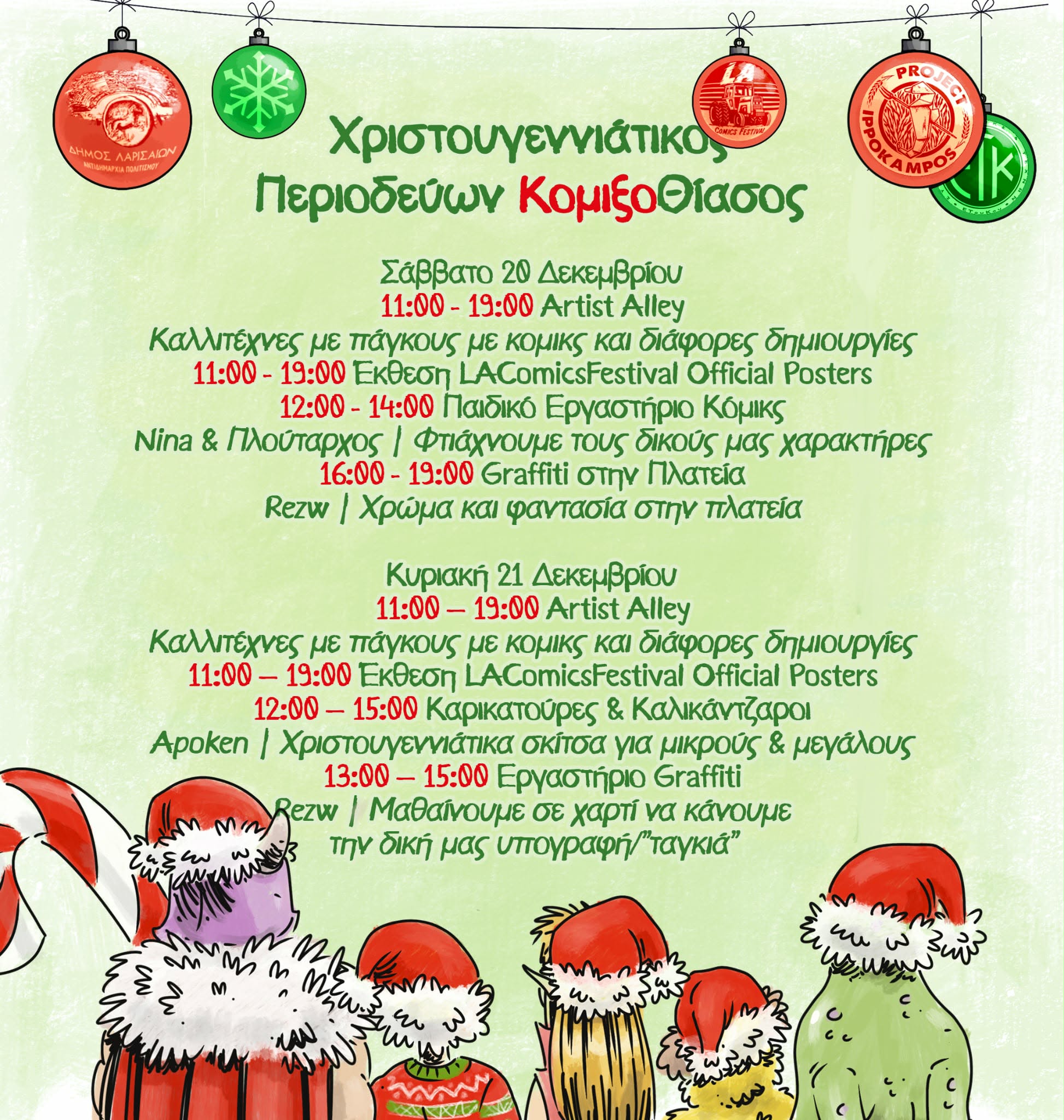 Μία διήμερη γιορτή αφιερωμένη στην τέχνη των κόμικς, στην street art και στη σύγχρονη εικονογραφική δημιουργία, με τον “Χριστουγεννιάτικο Περιοδεύων ΚομιξοΘίασο – LACOMICSFESTIVAL”, διοργανώνουν η Αντιδημαρχία Πολιτισμού Δήμου Λαρισαίων και το Project Ιππόκαμπος.