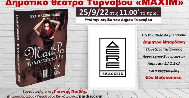 Το βιβλίο «Μαύρο Τριαντάφυλλο» της Εύας Μαζοκοπάκη θα παρουσιαστεί την Κυριακή 25 Σεπτεμβρίου 2022 και ώρα 11:00΄ το πρωί στο Δημοτικό Θέατρο Τυρνάβου. Η εκδήλωση θα πραγματοποιηθεί υπό την αιγίδα του Δήμου Τυρνάβου.