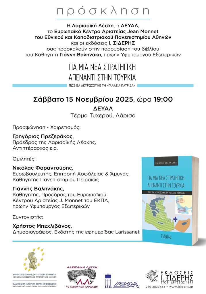 Η Δ.Ε.Υ.Α.Λ. διοργανώνει αύριο Σάββατο 15 Νοεμβρίου 2025 και ώρα 19:00 την παρουσίαση του βιβλίου του Καθηγητή Γιάννη Βαληνάκη, πρώην Υφυπουργού Εξωτερικών με τίτλο: «ΓΙΑ ΜΙΑ ΝΕΑ ΣΤΡΑΤΗΓΙΚΗ ΑΠΕΝΑΝΤΙ ΣΤΗΝ ΤΟΥΡΚΙΑ» η οποία θα πραγματοποιηθεί στην αίθουσα εκδηλώσεων της Δ.Ε.Υ.Α.Λ.