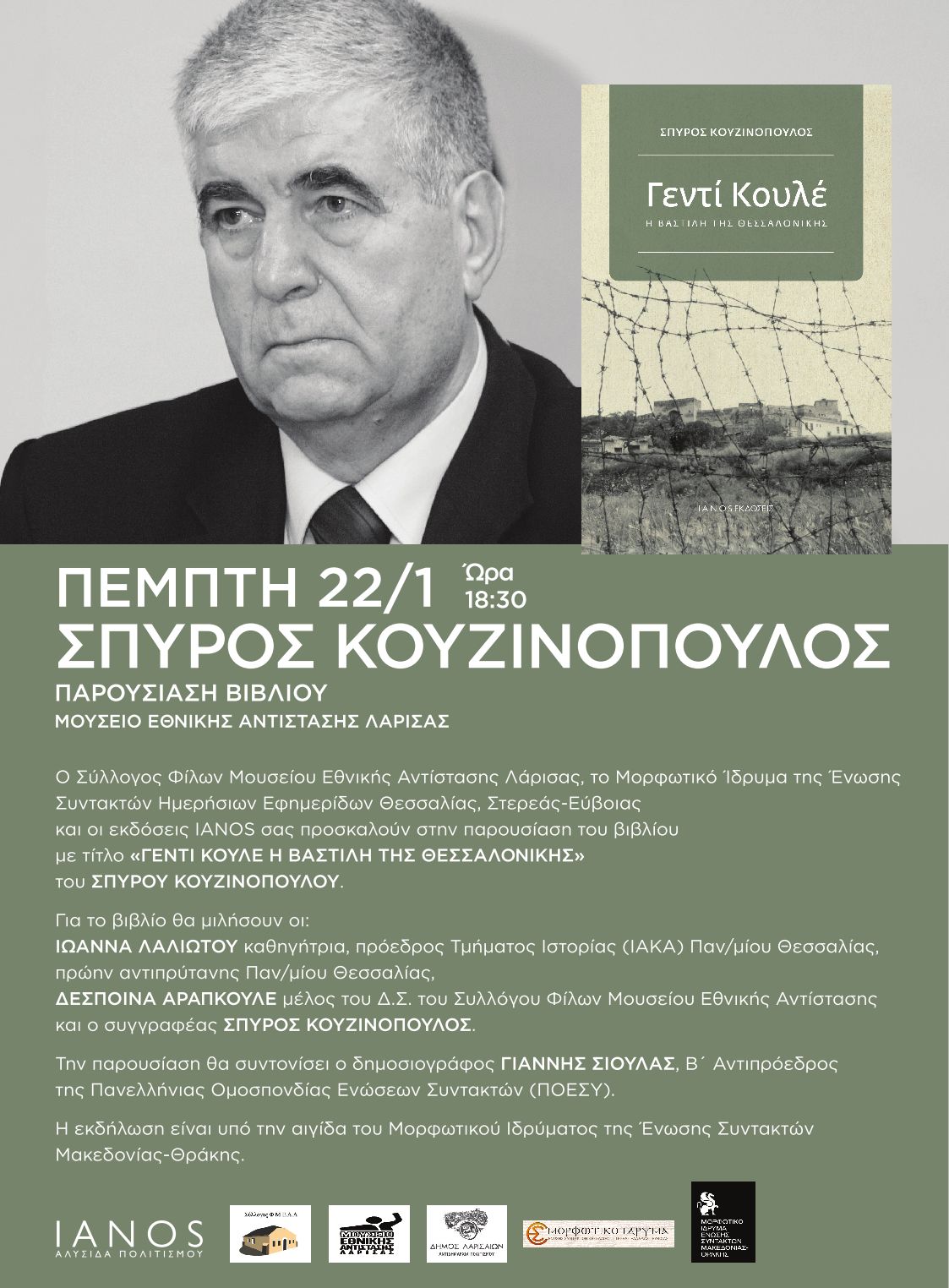 Το Μορφωτικό Ίδρυμα της Ένωσης Συντακτών Ημερήσιων Εφημερίδων Θεσσαλίας, Στερεάς – Εύβοιας, ο Σύλλογος Φίλων του Μουσείου Εθνικής Αντίστασης Λάρισας και οι εκδόσεις ΙΑΝΟΣ, παρουσιάζουν την Πέμπτη 22 Ιανουαρίου 2026, ώρα 18:30 στην αίθουσα εκδηλώσεων του Μουσείου Εθνικής Αντίστασης Λάρισας (οδός Ιουστινιανού 42), το βιβλίο του δημοσιογράφου και συγγραφέα Σπύρου Κουζινόπουλου με τίτλο «Γεντί Κουλέ η Βαστίλη της Θεσσαλονίκης».