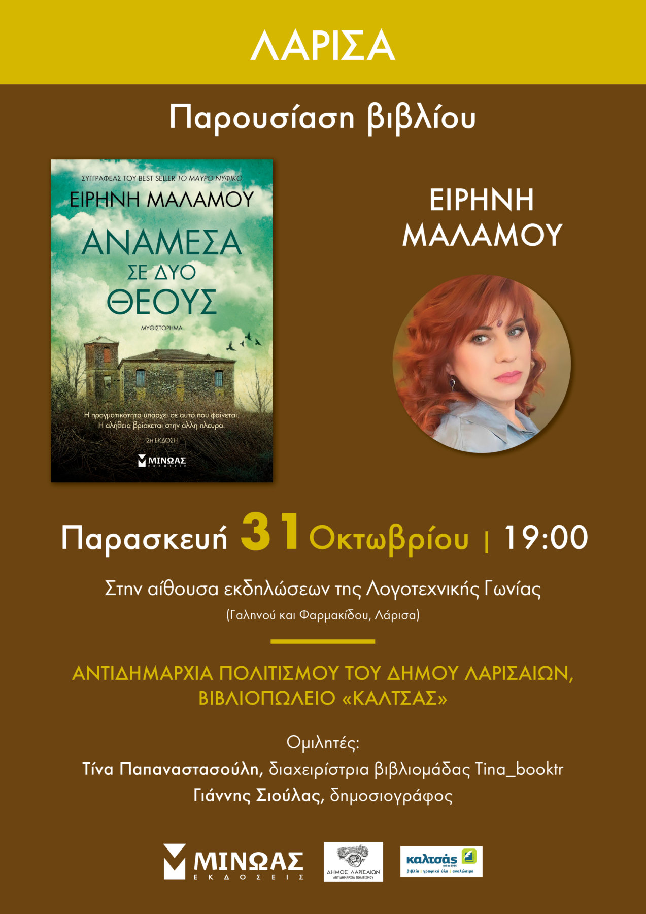 Την Παρασκευή 31 Οκτωβρίου 2025 παρουσιάζεται στη Λάρισα το βιβλλιο της Ειρήνης Μαλάμου «Ανάμεσα σε δύο Θεούς».