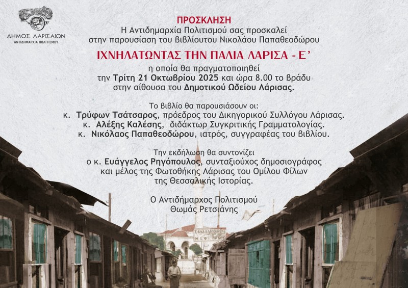 Παρουσιάζεται στη Λάρισα ο Ε΄ τόμος της σειράς βιβλίων του Νικολάου Παπαθεοδώρου ΙΧΝΗΛΑΤΩΝΤΑΣ ΤΗΝ ΠΑΛΙΑ ΛΑΡΙΣΑ – Ε’ την Τρίτη 21 Οκτωβρίου 2025 και ώρα 20.00 το βράδυ στο Δημοτικό Ωδείο Λάρισας.