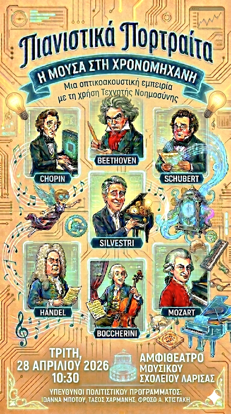 Το Μουσικό Σχολείο Λάρισας παρουσιάζει την Τρίτη, 28 Απριλίου 2026 και ώρα 10:30, την πρωτότυπη μουσική παράσταση «Πιανιστικά Πορτραίτα: Η Μούσα στη Χρονομηχανή» στο Αμφιθέατρο του σχολείου. Πρόκειται για μια ιδιαίτερη οπτικοακουστική εμπειρία, όπου η μουσική συναντά τη σύγχρονη τεχνολογία μέσω της χρήσης Τεχνητής Νοημοσύνης (AI) προσφέροντας στο κοινό μια διαδραστική επαφή με την Ιστορία της Μουσικής.
