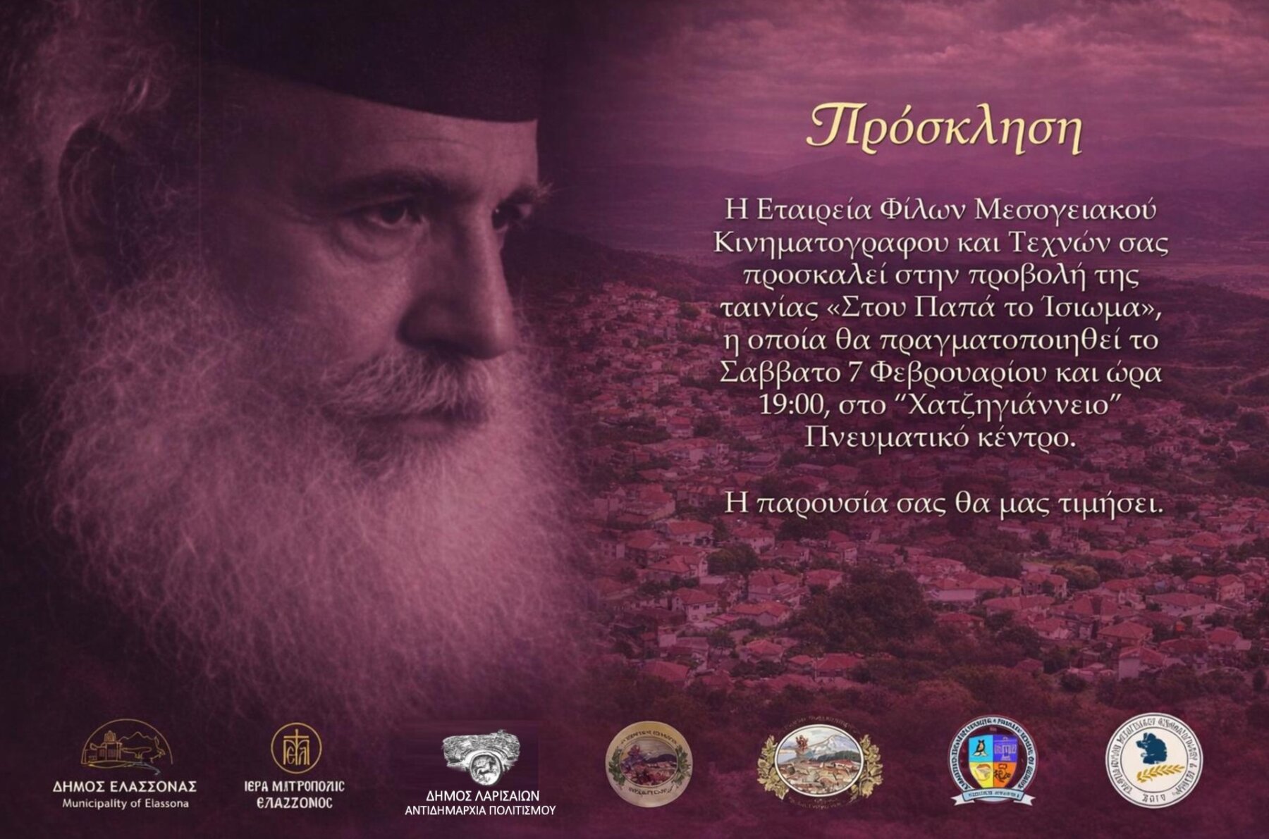 Η Εταιρεία Φίλων Μεσογειακού Κινηματογράφου & Τεχνών σε συνεργασία και σύμπραξη με την Αντιδημαρχία Πολιτισμού του Δήμου Ελασσόνας, την Αντιδημαρχία Πολιτισμού του Δήμου Λαρισαίων, την Ιερά Μητρόπολη Ελασσόνας και τον Μορφωτικό Σύλλογο Βερδικούσιας συνδιοργανώνουν κινηματογραφική προβολή της ταινίας «Στου Παπά το Ίσιωμα», το Σάββατο 7 Φεβρουαρίου 2026 και ώρα 19:00’ στο Χατζηγιάννειο Πνευματικό Κέντρο στη Λάρισα.