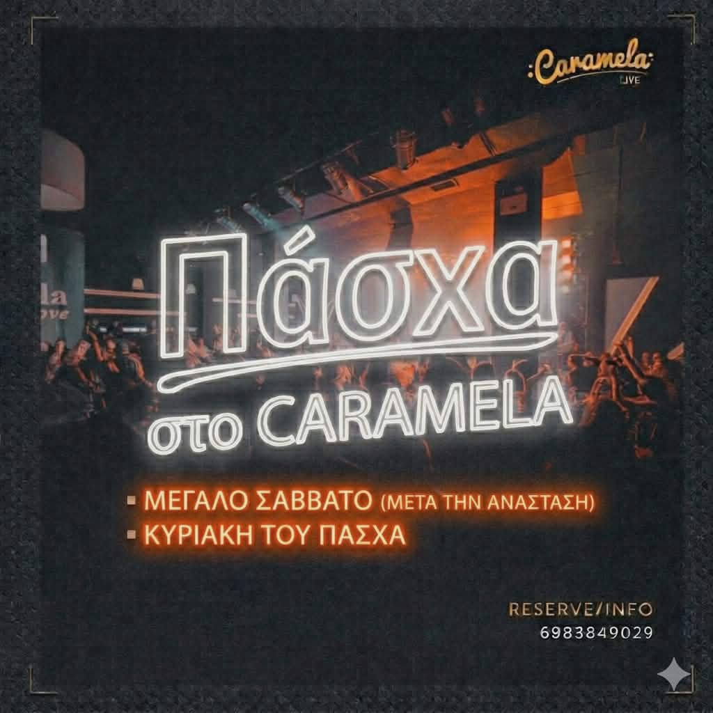 Το Πάσχα φέτος έχει ρυθμό… και λέγεται Caramela Live! Μετά την Ανάσταση, το Μεγάλο Σάββατο, συνεχίζουμε τη γιορτή με ανεβασμένη διάθεση, μουσική και μοναδική ενέργεια που κρατά μέχρι το πρωί! Και φυσικά, την Κυριακή του Πάσχα, σας περιμένουμε ξανά για να γιορτάσουμε όλοι μαζί, όπως μόνο εμείς ξέρουμε – με κέφι, χορό και τις καλύτερες επιτυχίες! Φορέστε το χαμόγελό σας, πάρτε την παρέα σας και ελάτε να ζήσουμε ένα αξέχαστο πασχαλινό διήμερο γεμάτο διασκέδαση! Caramela Live Πληροφορίες για κρατήσεις 6983849029