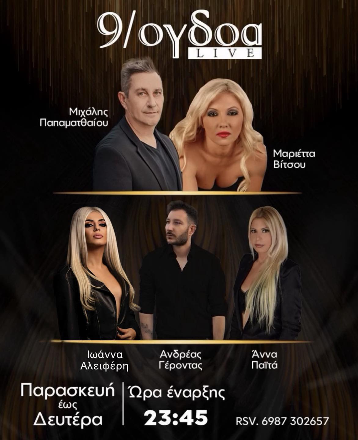 Πάμε στα… περιφερειακά της πόλης μπουζούκια, με πρώτο το 9/όγδοα Live (3ο Χλμ Λάρισας – Αμπελώνα) στην Γιάννουλη. Εκεί συνεχίζει… η μεγάλη περσινή μεταγραφή – Μιχάλης Παπαματθαίου ως πρώτο όνομα, με την Μαριέτα Βίτσιου να έχει επίσης παραμείνει από πέρυσι. Η “εκρηκτική” Αθηναία Ιωάννα Αλειφέρη εντάχθηκε κι αυτή στο φετινό σχήμα, μαζί με την… περπατημένη από πίστες και πανηγύρια Άννα Παϊτά και τον Καρδιτσιώτη Ανδρέα Γέροντα.