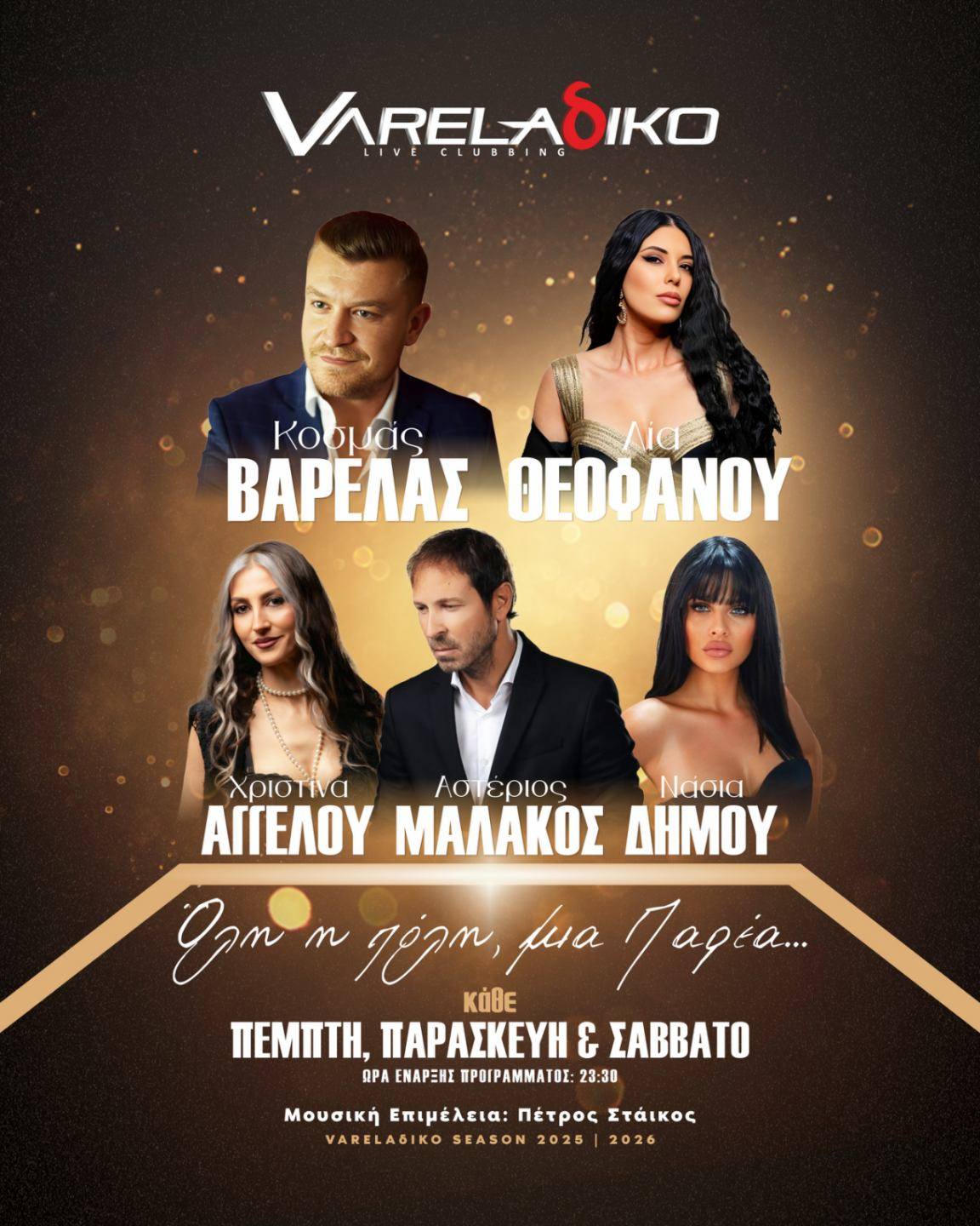 Συνεχίζουμε με το Vareladiko Live Clubbing (Βύρωνος 19), όπου εκτός από την σταθερά του Κοσμά Βαρελά (εκ των ιδιοκτητών) και του Αστέρη Μαλάκου που ήταν και πέρυσι, έχουμε την νέα προσθήκη της Νάσιας Δήμου, καθώς και της έμπειρης Λίας Θεοφάνου και της Χριστίνας Αγγέλου που όμως τραγουδούσανε και στο καλοκαιρινό Enastron, της ίδιας ιδιοκτησίας. Και μιας και το αναφέραμε το Enastron Summer Theater Live Clubbing (5ο χλμ Λάρισας-Φαρσάλων) ίσως ανοίγει και φέτος κάποιες (εορταστικές κυρίως) βραδιές του χειμώνα και ας είναι θερινό.
