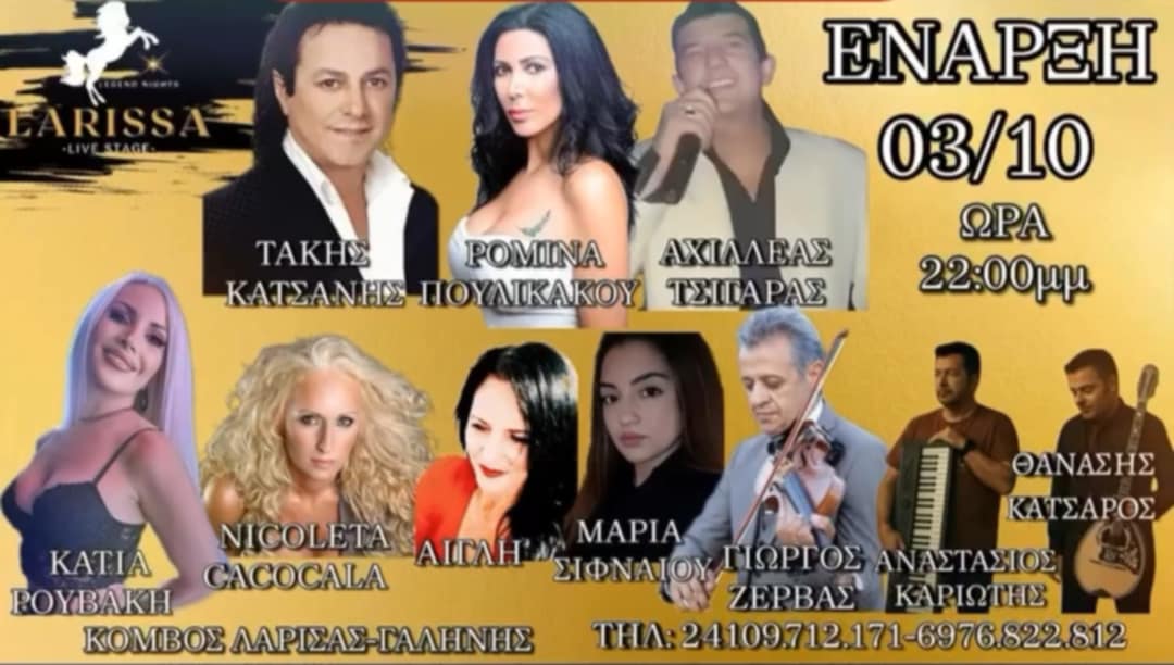 Το δεύτερο εκτός Λάρισας κέντρο διασκέδασης είναι το Larissa Live Stage που βρίσκεται στον δρόμο Πλατυκάμπου στην στροφή προς Γαλήνη. Για πιο after και αυθεντικές καταστάσεις, το πρόγραμμα του αποτελείται από τον “θρύλο” του γλεντιού Αχιλλέα Τσιγάρα και τους: Τάκη Κατσάνη, Ρομίνα Πουλικάκου, Κάτια Ρουβάκη, Nicoleta Cacocala, Αίγλη και Μαρία Σιφναίου.