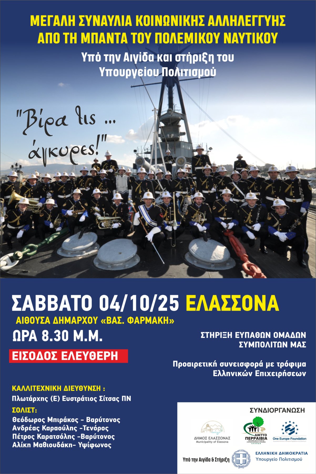 Η περίφημη Μπάντα του Πολεμικού Ναυτικού επιστρέφει στην Ελασσόνα για μια ξεχωριστή συναυλία με τίτλο «Βίρα τις άγκυρες!» σε συνεργασία με τη Φιλαρμονική Ορχήστρα του Δήμου Ελασσόνας, το Σάββατο 4 Οκτωβρίου και ώρα 20:30 μ.μ. στην Αίθουσα Θεάτρου «Δημάρχου Βασ. Φαρμάκη» με ελεύθερη είσοδο για το κοινό.