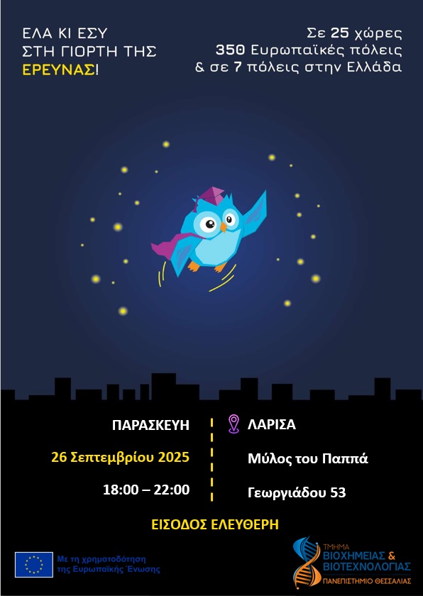 Όπως επισημαίνεται στην ανακοίνωση, “η δράση θα πραγματοποιηθεί την Παρασκευή 26 Σεπτεμβρίου 2025, από τις 18.00 έως τις 22.00, στον προαύλιο χώρο του Μύλου του Παππά στη Λάρισα, ώστε να ανακαλύψουμε μαζί τον κόσμο της επιστήμης μέσα από δράσεις, πειράματα και παιχνίδια για όλους. Στο χώρο θα βρίσκονται ερευνητές από τα εργαστήρια του Τμήματος Βιοχημείας και Βιοτεχνολογίας του Πανεπιστημίου Θεσσαλίας όπου θα παρουσιάζουν πληροφορίες από την έρευνα τους, κατάλληλα προσαρμοσμένα για κάθε ηλικία παιδιών. Θα συζητήσουμε θέματα σχετικά με την ποιότητα των τροφίμων που καταναλώνουμε καθημερινά και την επίδρασή τους στην υγεία μας, θα θίξουμε περιβαλλοντικά θέματα όπως η ανακύκλωση, η αειφορία και η αξιοποίηση υποπροϊόντων παραγωγής τρόφιμών. Καθ’ όλη τη διάρκεια της βραδιάς θα πραγματοποιούνται live πειράματα, παιχνίδια, ζωγραφική, αστροπαρατήρηση ώστε τα παιδιά με απλό και προσιτό τρόπο να έρθουν σε επαφή με σημαντικά θέματα της επιστήμης”.
