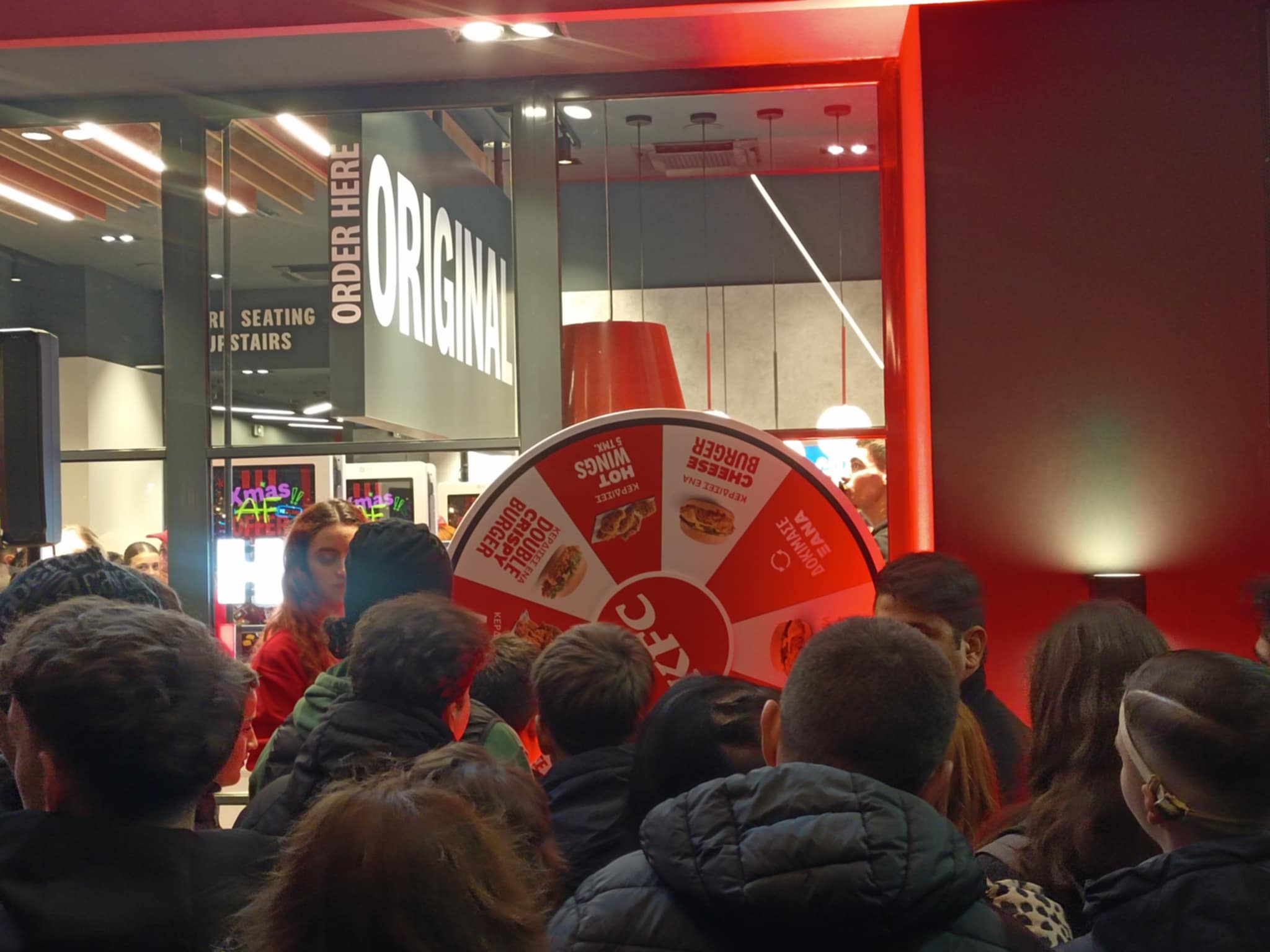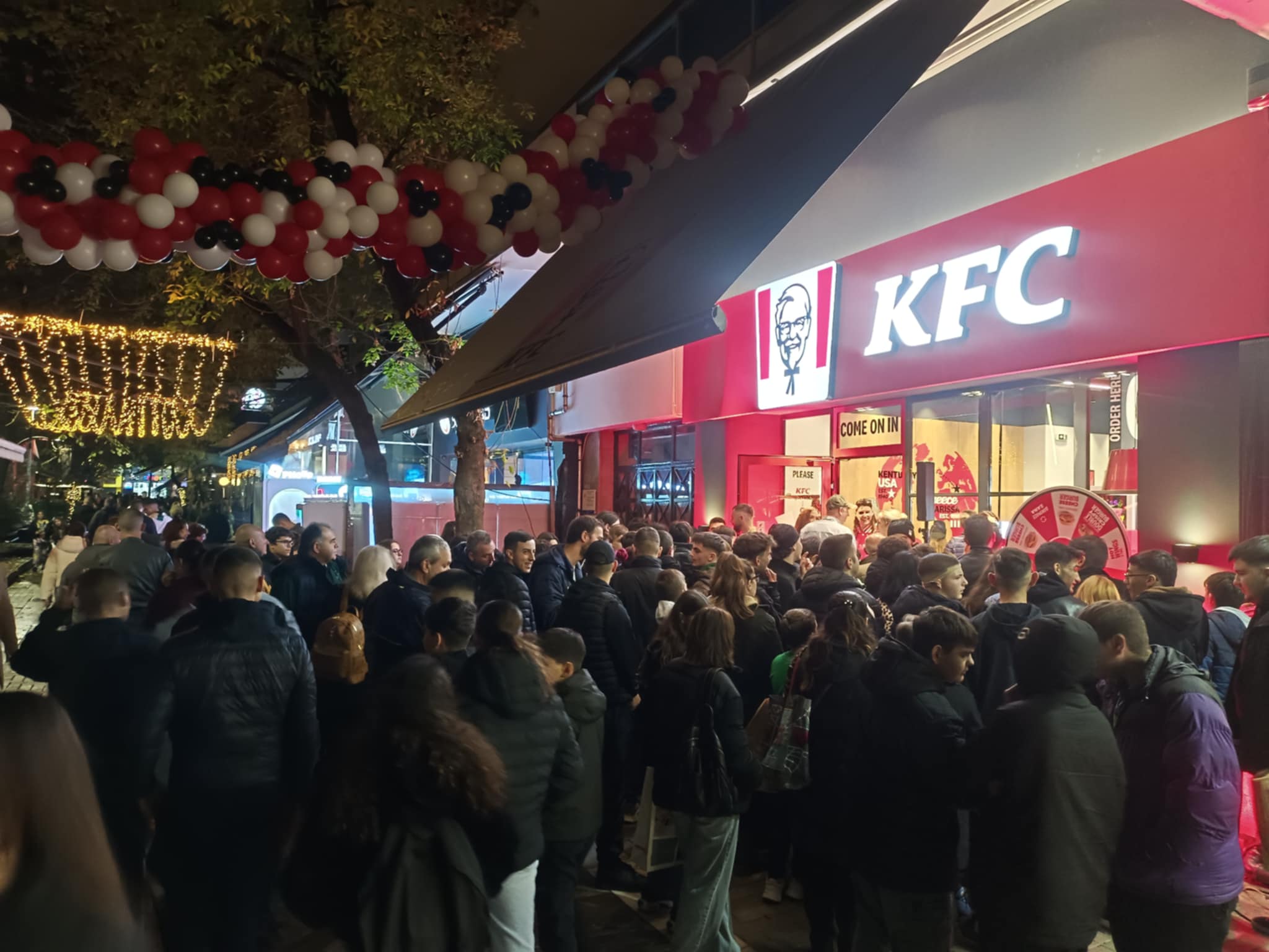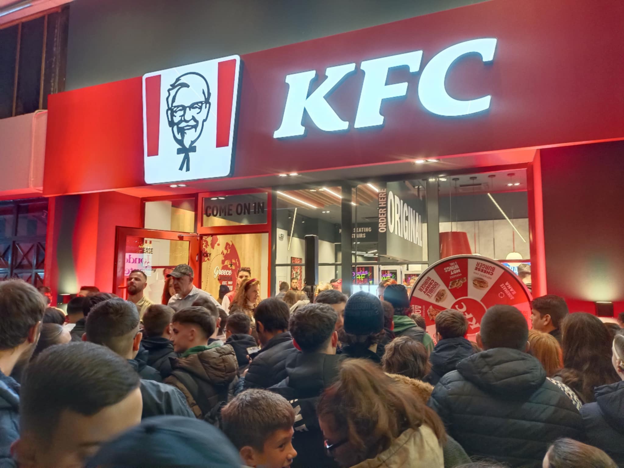 Το πρώτο κατάστημα της γνωστής αμερικανικής αλυσίδας τηγανητού κοτόπουλου στην πόλη, σε συνδυασμό με τον… παροξυσμό της black Friday δημιούργησαν ουρές έξω απ’ το κατάστημα, μάλιστα υπήρχε και τροχός της τύχης που κέρδιζες δωρεάν γεύματα.
