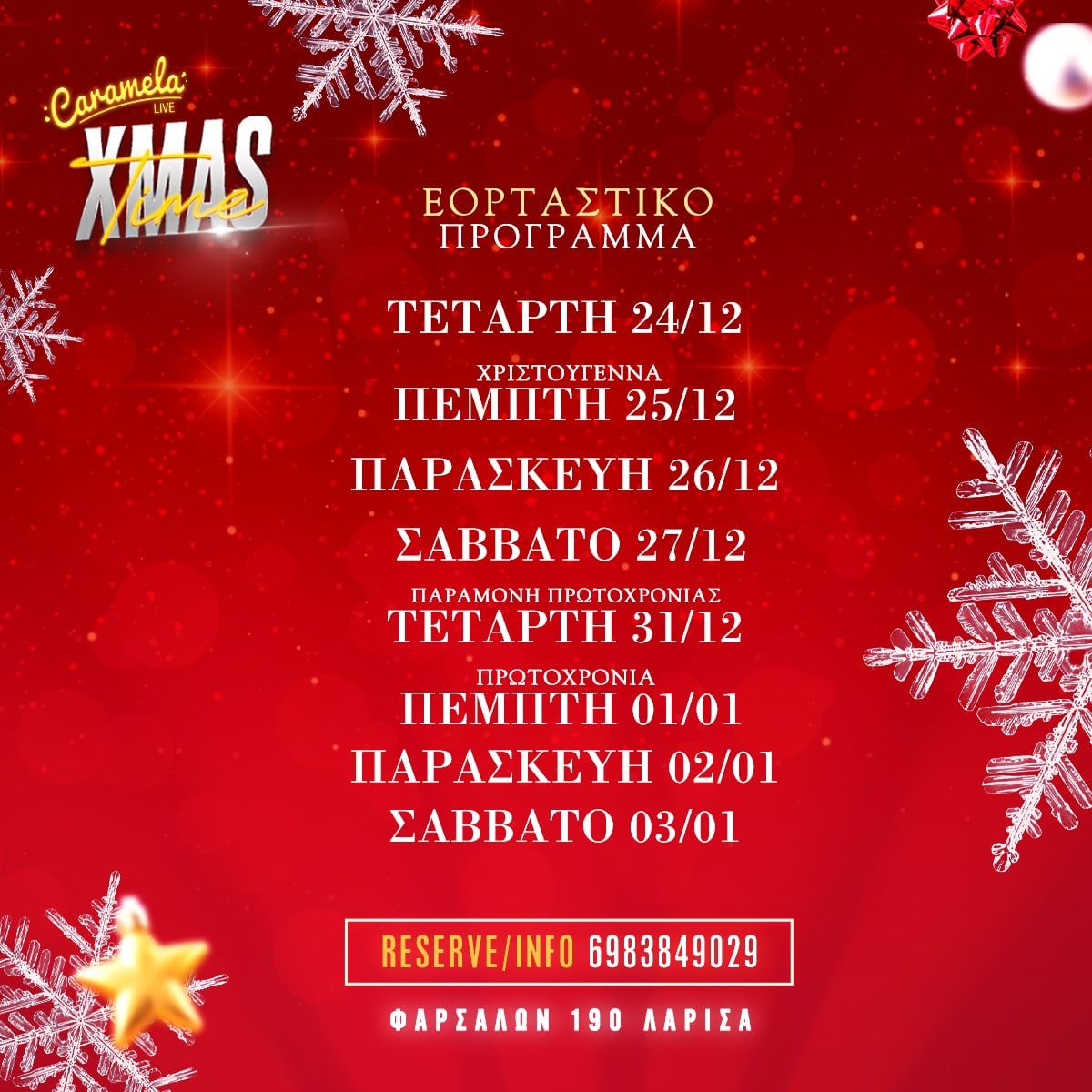 Το Caramela Live στη Λάρισα υποδέχεται τις φετινές γιορτές με ένα εντυπωσιακό, συνεχόμενο πρόγραμμα που υπόσχεται ατελείωτο κέφι, ζωντανή μουσική και μοναδικές εμφανίσεις.