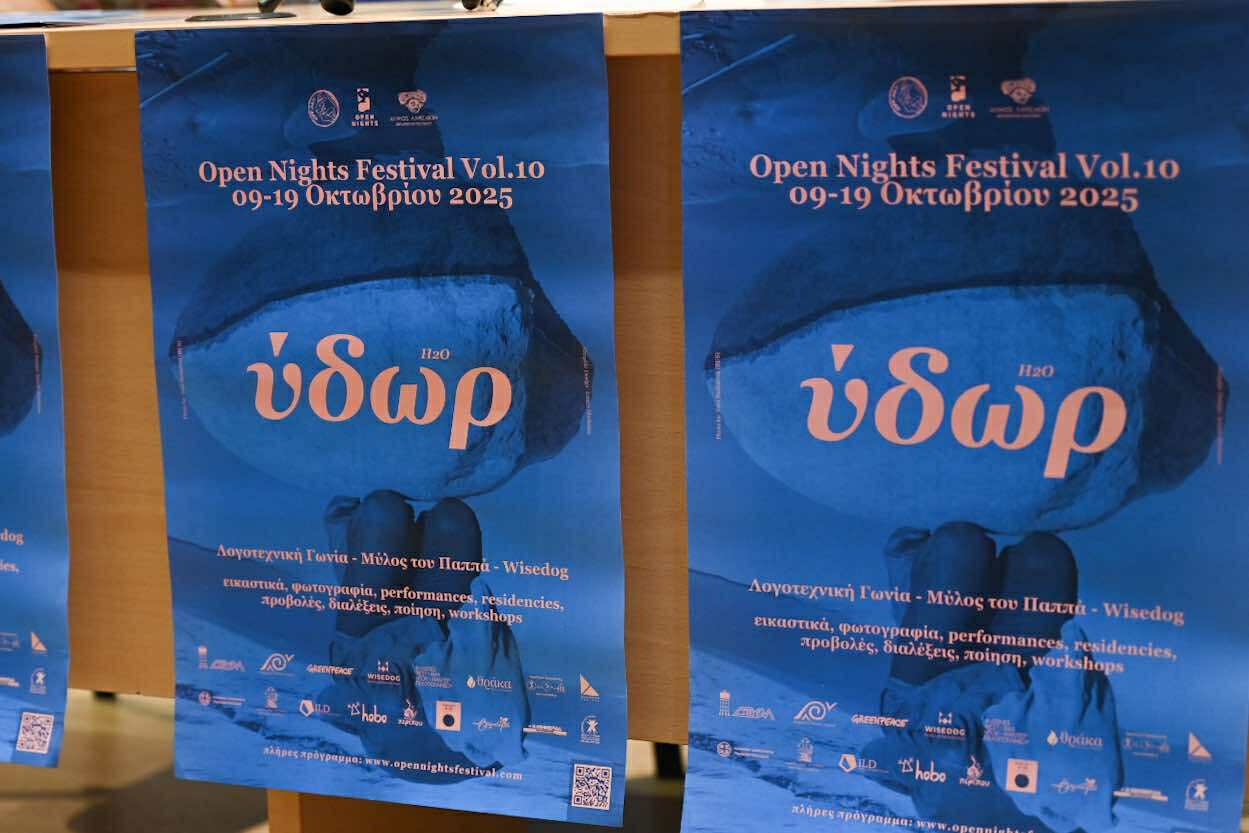 Με 48 δημιουργούς -εικαστικούς, δημιουργούς βίντεο & φωτογραφίας- από όλον τον κόσμο, πλήθος παραστάσεων, συναυλιών, σεμιναρίων και δράσεων ανοίγει τις πύλες του το Φεστιβάλ Open Nights, με κεντρικό θέμα το «Ύδωρ», από τις 9 ως τις 19 Οκτωβρίου 2025 -τα εγκαίνια έχουν οριστεί για τις 7.30 μ.μ. το απόγευμα της Πέμπτης, 9 Οκτωβρίου, στη Λογοτεχνική Γωνία.