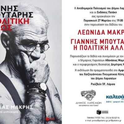 Η Αντιδημαρχία Πολιτισμού του Δήμου Λαρισαίων και οι Εκδόσεις Πατάκη προσκαλούν το κοινό την Παρασκευή 27 Μαρτίου στις 19:00 στην