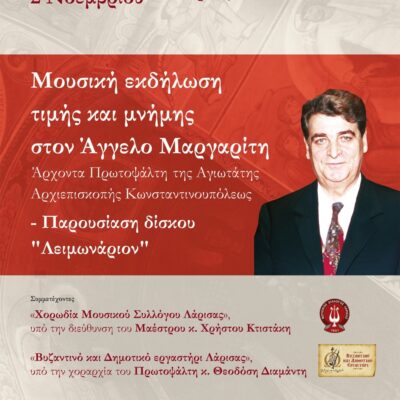 Εκδήλωση προς τιμήν του αείμνηστου Άρχοντα Πρωτοψάλτη της Αγιωτάτης Αρχιεπισκοπής Κωνσταντινουπόλεως Άγγελου Μαργαρίτη (Ιεροψάλτη Ι.Ν. Αγίων Κωνσταντίνου & Ελένης Λάρισας),