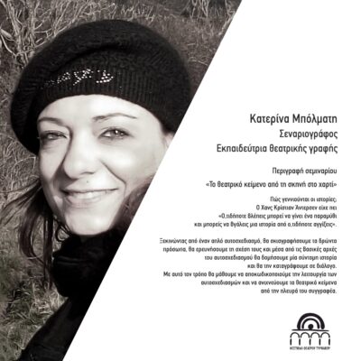 Μέσω ανακοίνωσης του, ο Δήμος Τυρνάβου ενημερώνει για την παρουσία της σεναριογράφου και εκπαιδεύτριας θετρικής γραφής, Κατερίνα Μπολμάτη στο 1ο