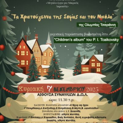 Τη μουσική παράσταση «Τα Χριστούγεννα της Σοφίας και του Νικόλα», μια γιορτινή ιστορία βασισμένη στις μουσικές του Children’s Album του
