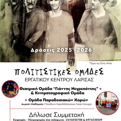 Μέσω ανακοίνωσης του, το Εργατικό Κέντρο Λάρισας προσκαλεί τους ενδιαφερόμενους πολίτες για να συμμετάσχουν στις πολιτιστικές του ομάδες. Δείτε αναλυτικά: