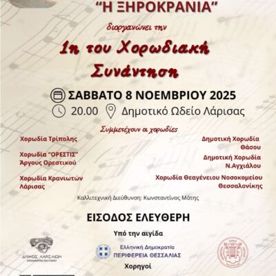 Ο Σύλλογος Κρανιωτών Λάρισας και Περιχώρων «η Ξηροκρανιά» διοργανώνει την πρώτη του χορωδιακή συνάντηση σήμερα Σάββατο 8 Νοεμβρίου 2025, στις
