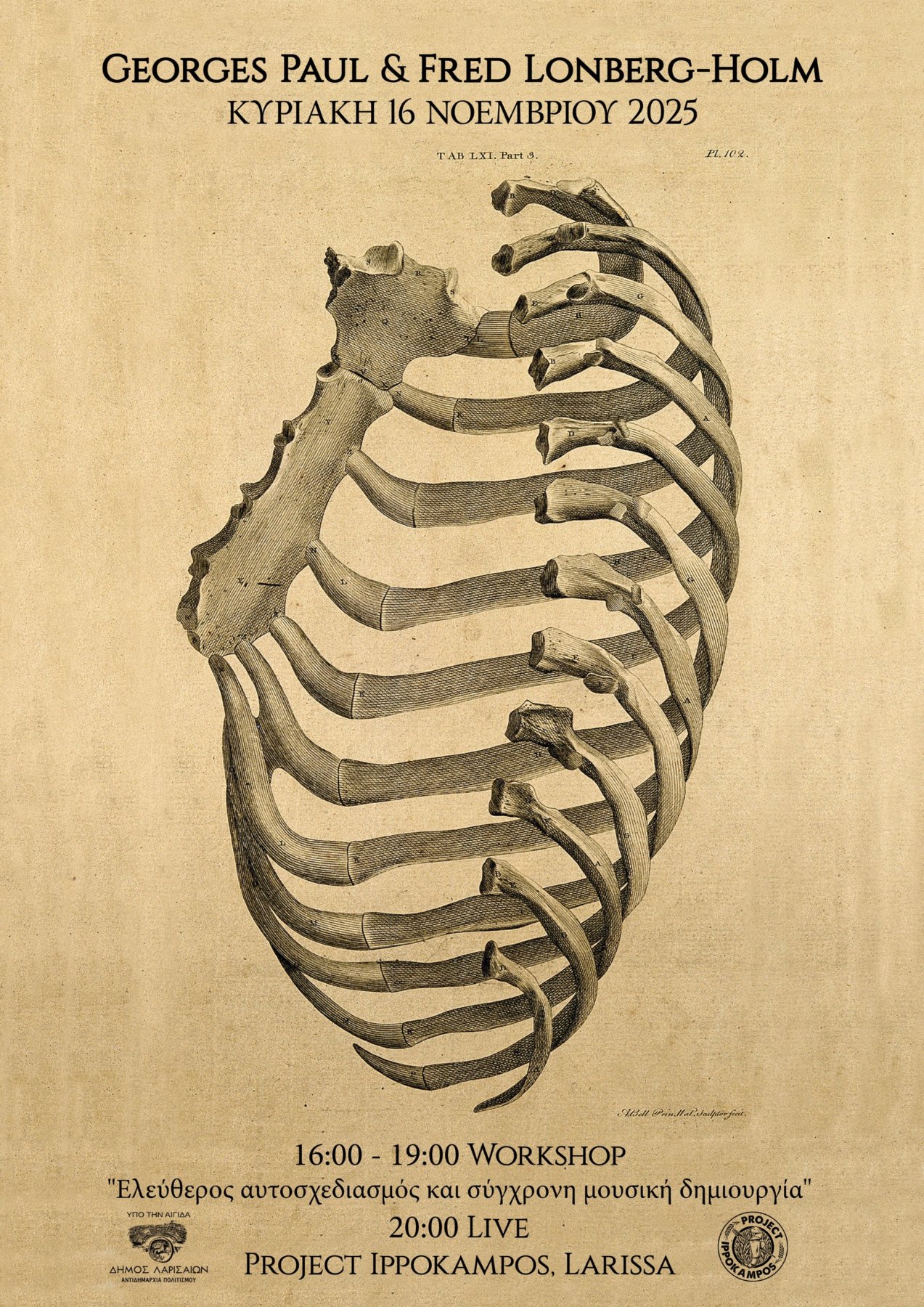Η Αντιδημαρχία Πολιτισμού του Δήμου Λαρισαίων και το Project ΙππόΚαμπος παρουσιάζουν μια ξεχωριστή Κυριακή αφιερωμένη στον ελεύθερο αυτοσχεδιασμό και τη σύγχρονη μουσική δημιουργία, με τη συμμετοχή δύο κορυφαίων καλλιτεχνών της διεθνούς πειραματικής σκηνής: του σαξοφωνίστα Georges Paul και του τσελίστα Fred Lonberg-Holm.